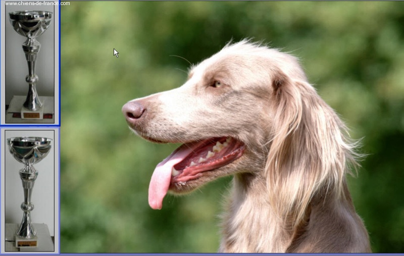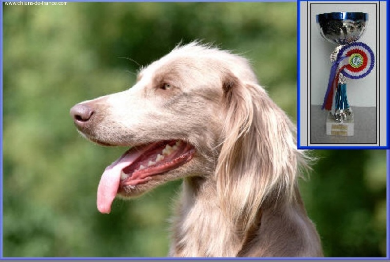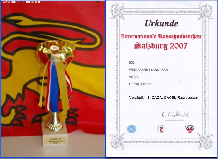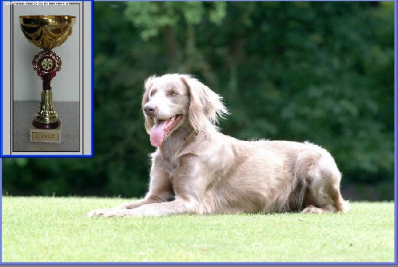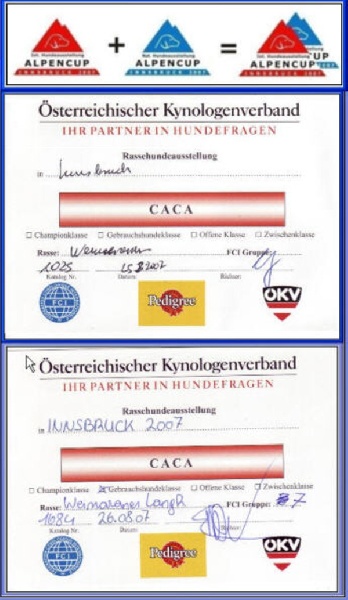 Excellent 1, CAC-Autriche, CACIB en Exposition Internationale, catalogue:1025<p>Excellent 1, CAC-Autriche en Exposition Nationale, catalogue:1686<p>Titre spécial:<p><strong> Meilleure Lice Braque de Weimar Poil Long</strong><br>