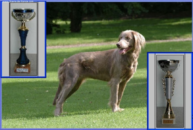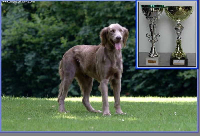 C'est une grande chienne puissante, élegante et très bien découplée. Ses résultats de travail sont très promettants, elle a passé le TAN et s'est classée TB1 en Field Gibier Tiré, sa formation de chasse interrompue par sa première portée a repris dès novembre 2006.