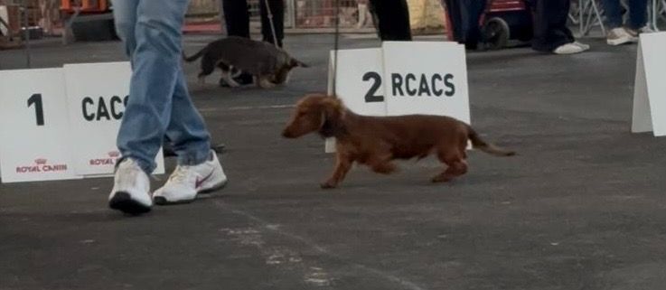 TP 32,5. JOLIE TETE. TRES BONNE ENCOLURE, POITRINE ET DOS. TRES BONNES ANGULATIONS. TRES BONNE DEMARCHE. EXC DENSITE DE POIL. TRES BONNE PRESENTATION