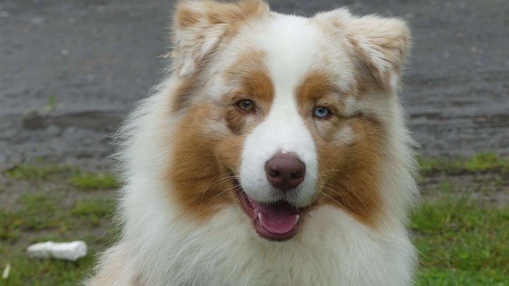 C?est un rouge merle aux yeux vairons (un marron-vert et un bleu clair).