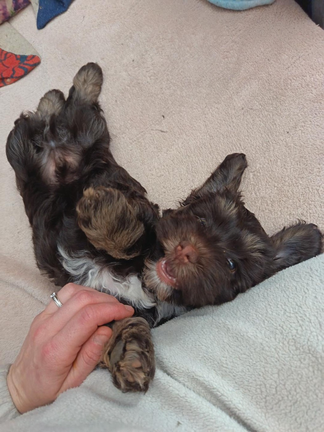 Notre petit Alexeï est un petit chien tout gentil qui adore les câlins mais aussi jouer avec les copains chiens et humains de la maison. Il devient de plus en plus beau avec sa belle fourure Chocolat et TAN. C'est un petit chien tout le temps joyeux !
