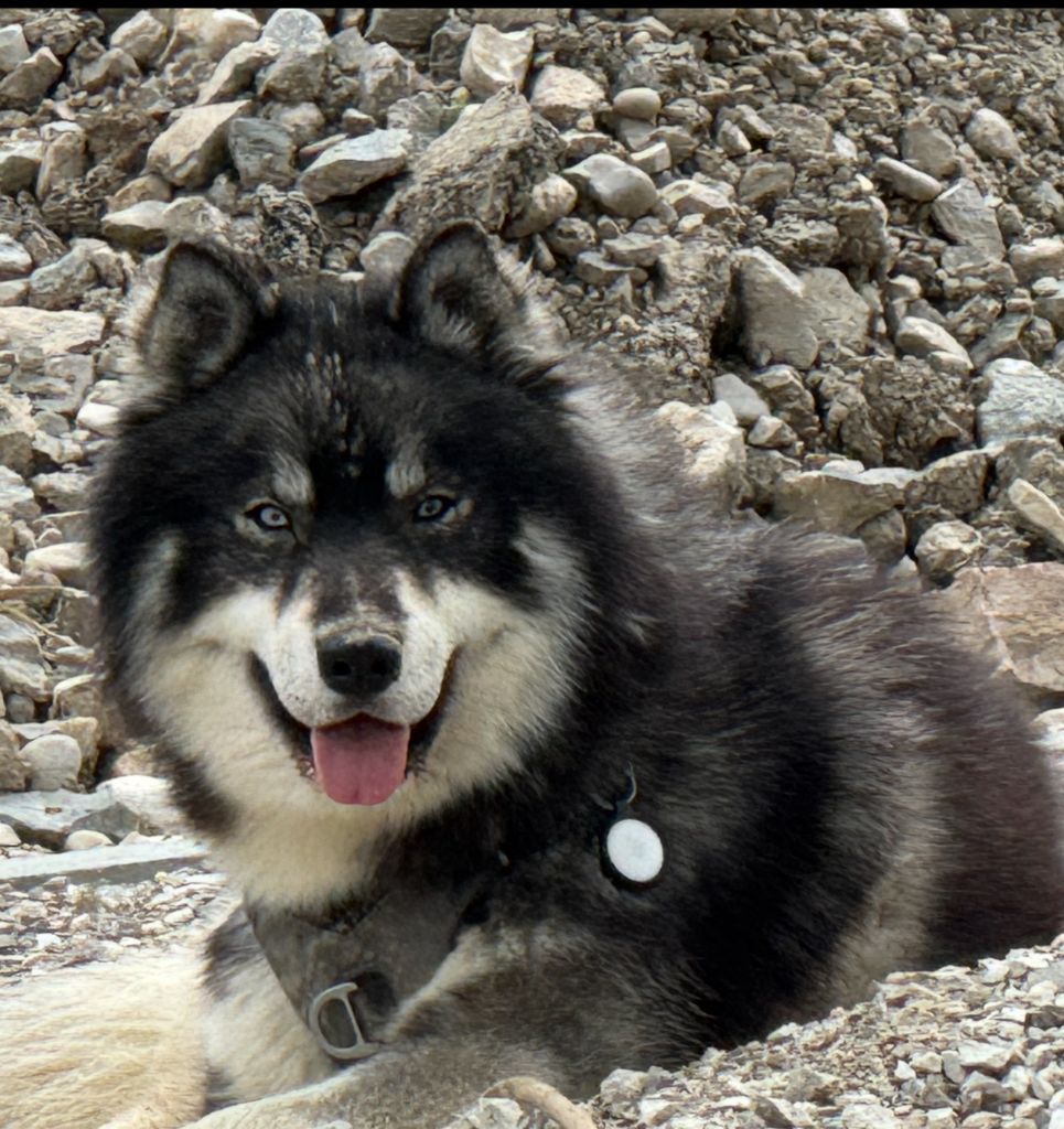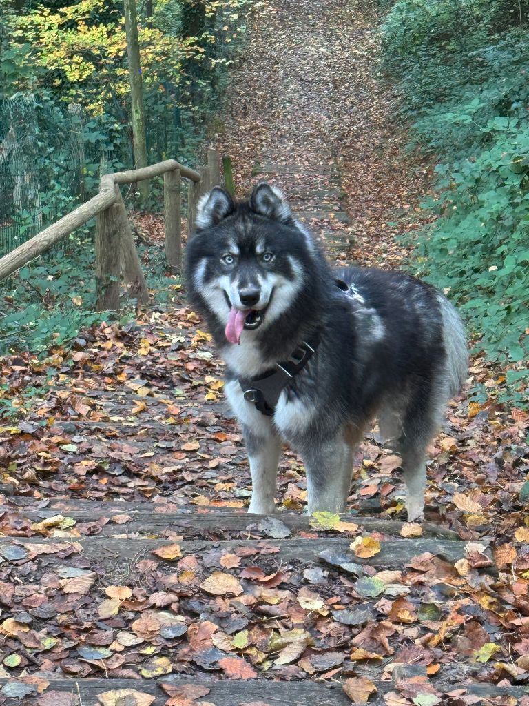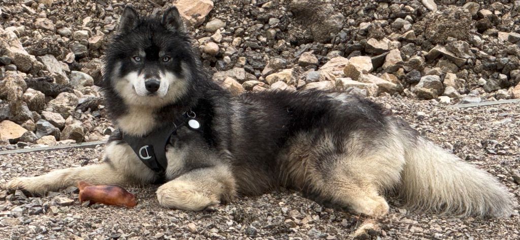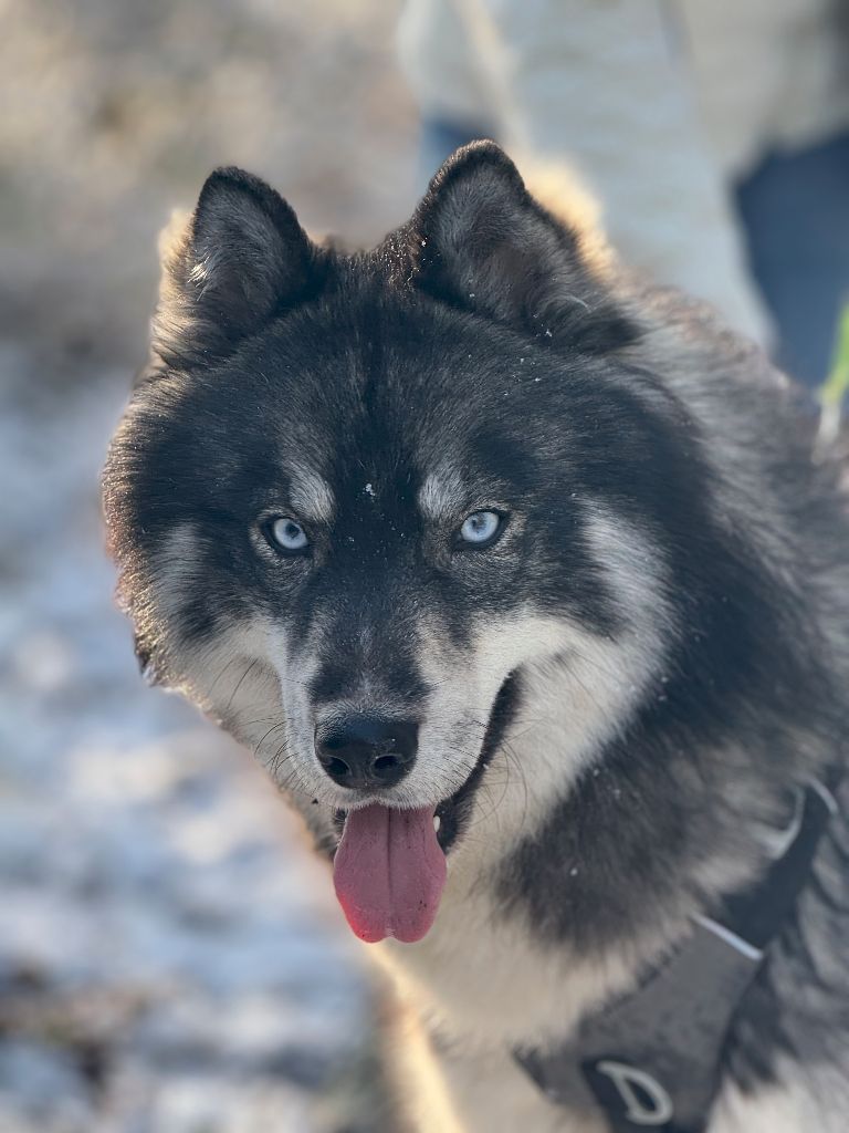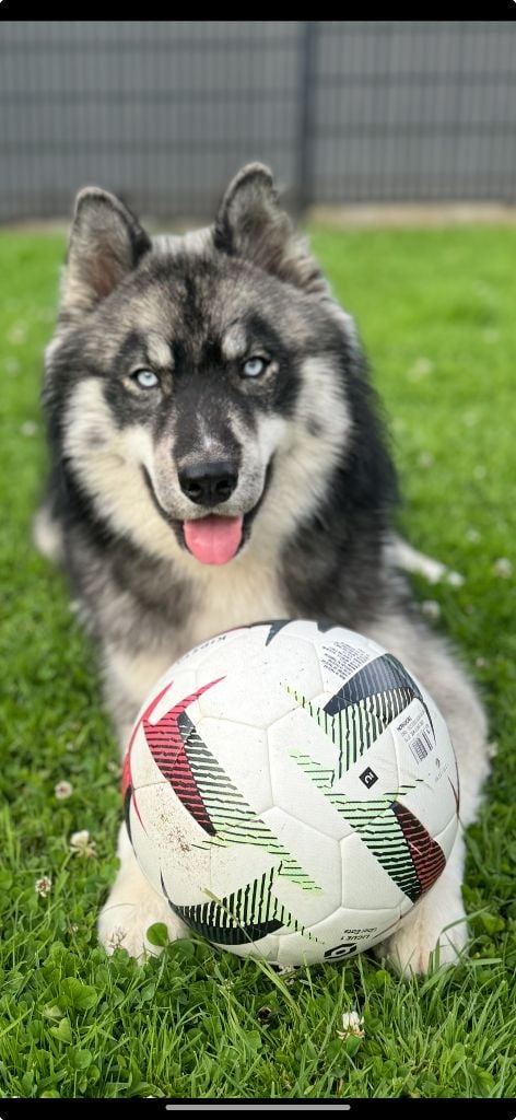 Mâle Husky de Sibérie de 2 ans à la robe gris loup et blanc doté d'un masque typique et très expressif.