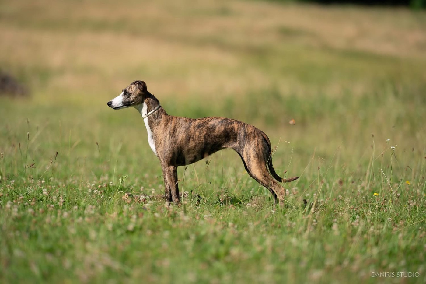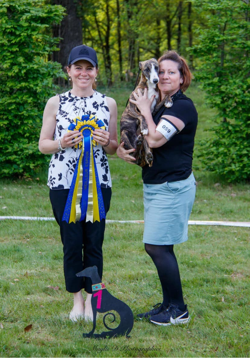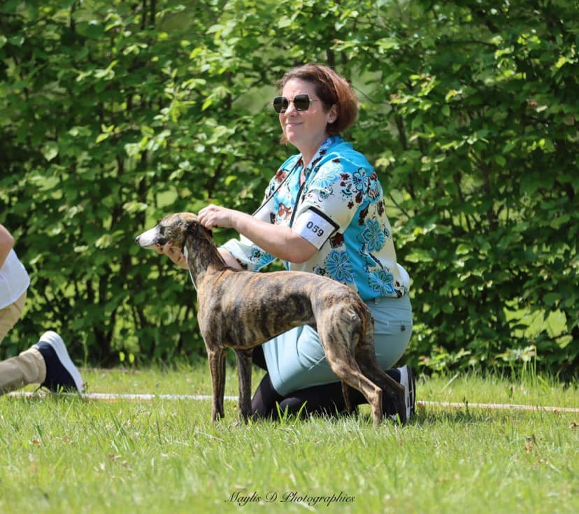 Sue c'est d'abord une génétique de grande qualité, avec des champions internationaux qui remplissent sa généalogie :) Je suis très heureuse d'avoir cette génétique Sobresalto (entre autre), qui produit un type de chien que j'aime. Mais c'est aussi une chienne bien construite, avec du muscle et de l'os, qui en fait une whippet athlétique et féminine.