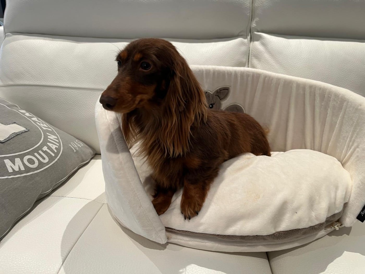 ANOUK , femelle teckel a poil long marron et fauve . Elle est a vendre car elle est le souffre douleur de deux de mes chiennes. C'est une petite teckel très gentille, sociable, câline .... une crème. Agée de 6 mois. LOF. Poids 3kg. Parents testés pour les maladies génétiques , et sains