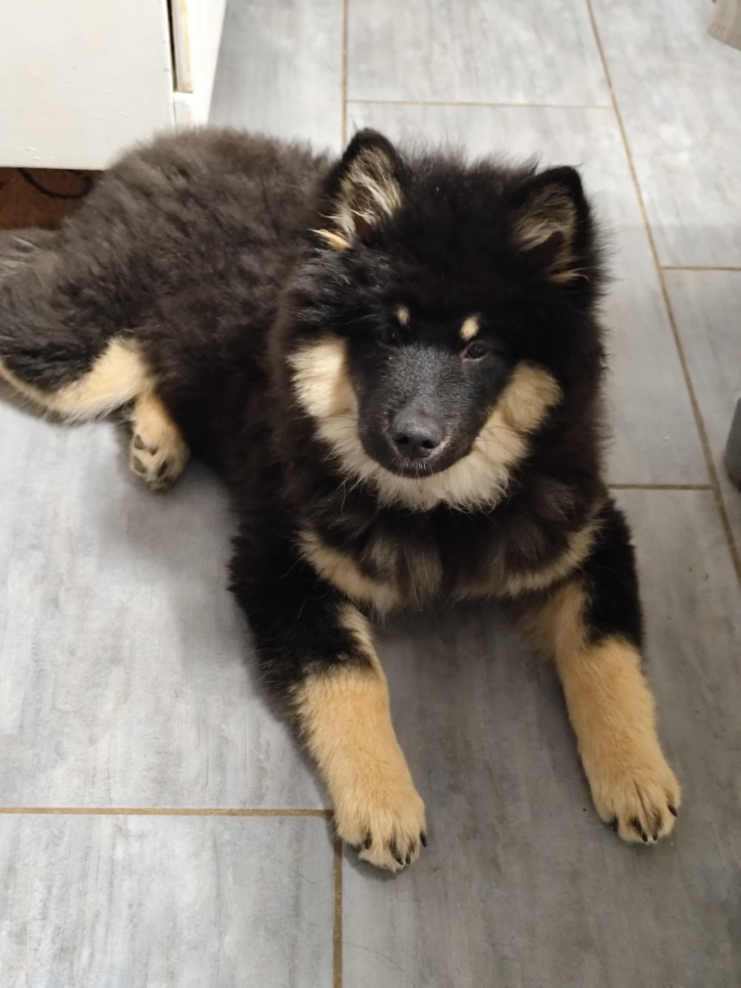 Ce petit bout de canaille au regard coquin vient agrandir l'élevage et a desuite été adoptée par les autres. Inutile de dire qu'elle me suit partout, fait déjà sa petite concierge sur la terrasse, vole les pantoufles et regroupe tous ses trésors au pied de mon lit. A l'aise dans ses patounes, hyper câline, elle est rigolote et apporte ainsi un vent de bonheur à la maison. Merci à Marine des Loups de Niflheim de me l'avoir confiée, je sens que nous avons là un sacré phénomène....