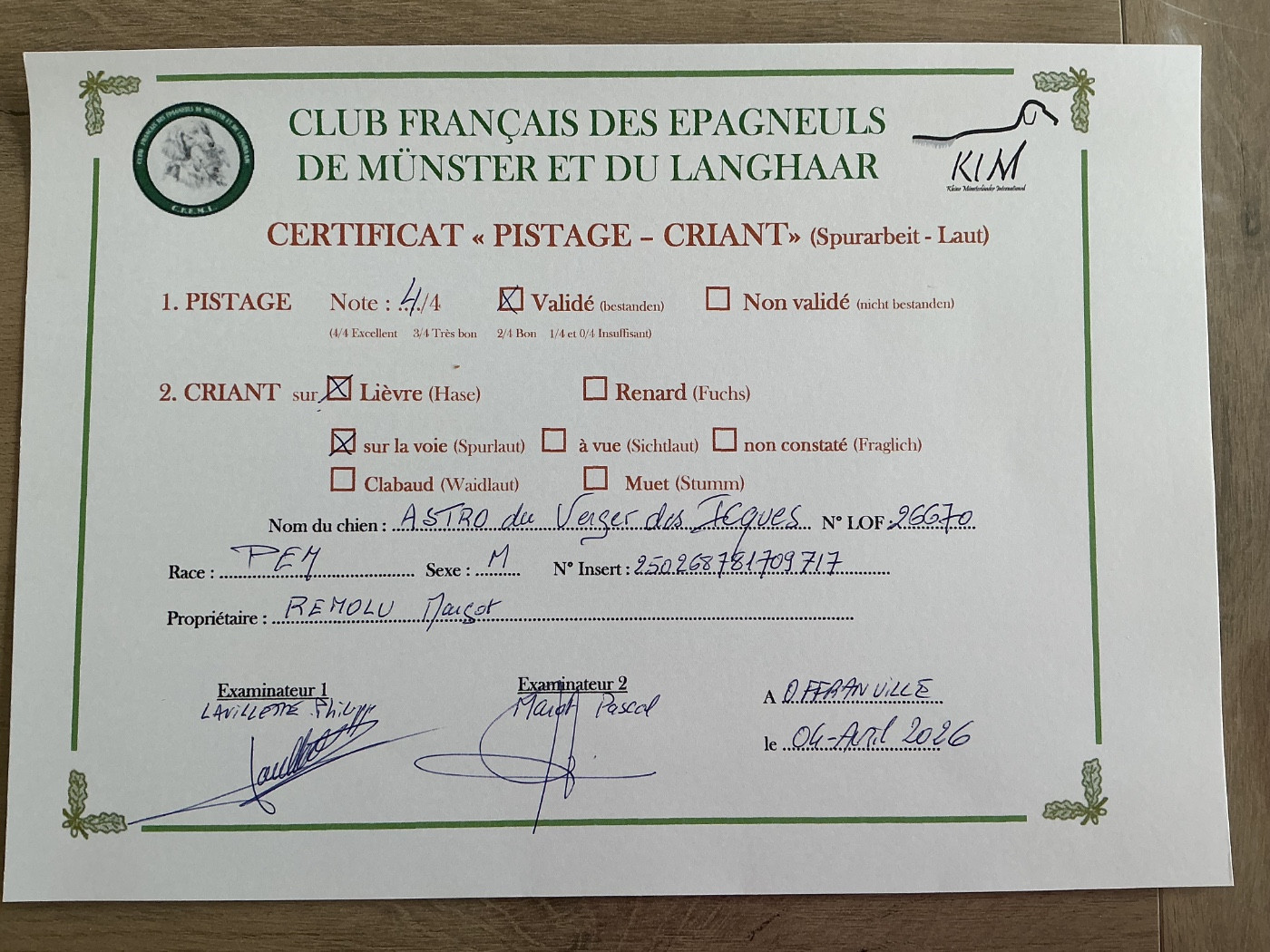 Manifestion : CERTIFICAT PISTAGE CRIANT - Juge : MR LAVILLETTE Philippe et MR MAROT Pascal