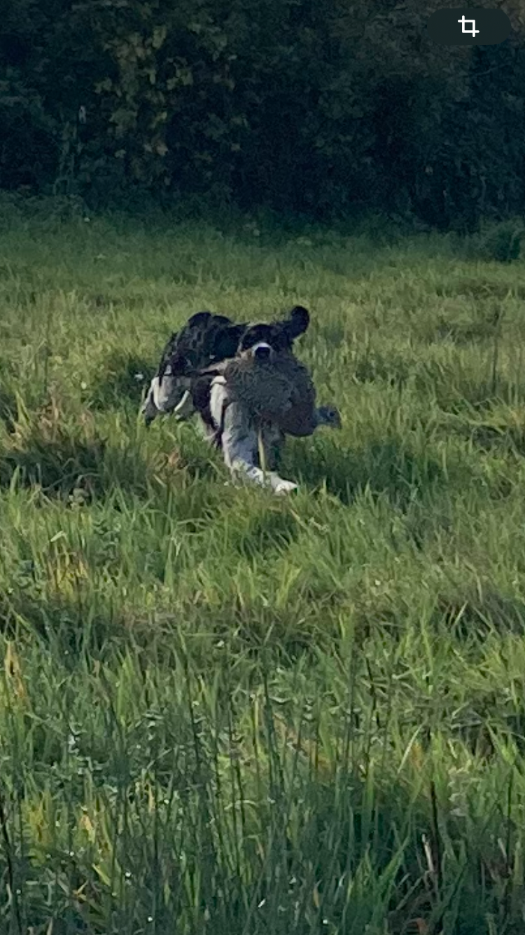Chien de famille et de chasse très actif. Il marque l'arrêt, chasse et rapporte depuis ses 6 mois. Il est tres prometteur.