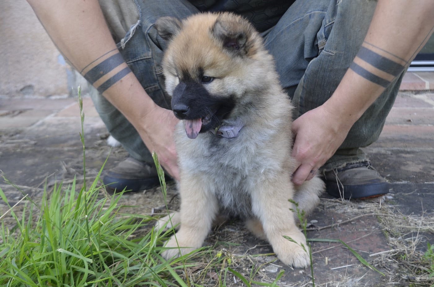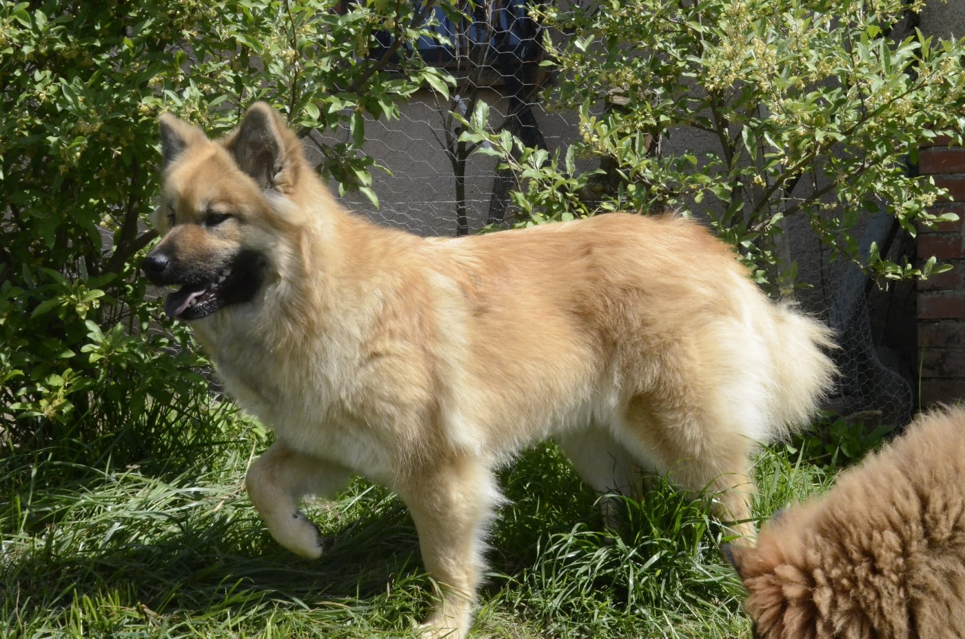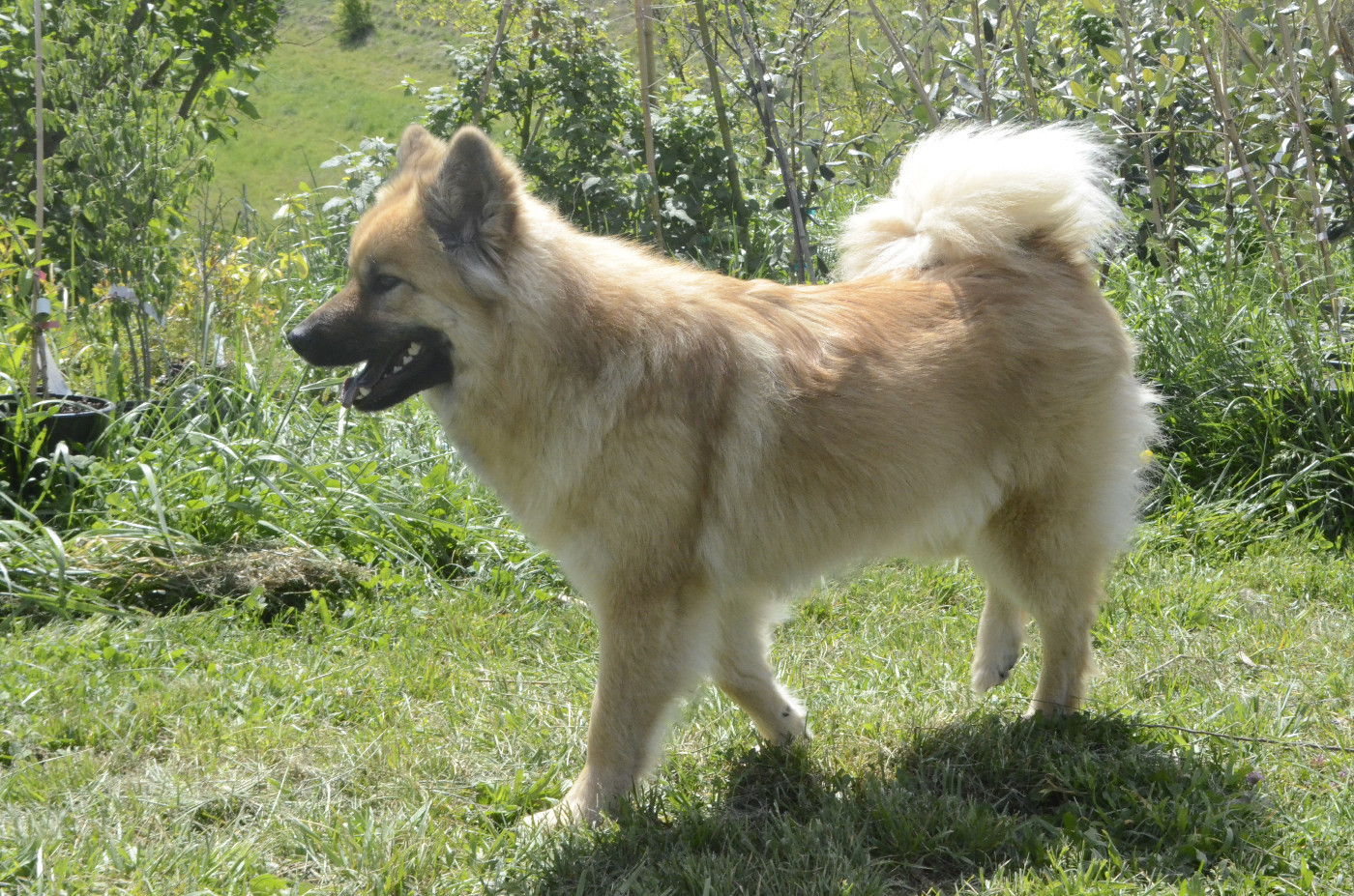Physiquement notre Paprika'lin est assez fine mais plutot haute, 18kg (comme sa maman avant d'avoir des petits!), de couleur fauve avec un masque assez peu prononcé. Elle est d'ailleurs hétérozygote sur le masque noir/masque blanc : en cas de mariage avec un masque blanc (ce qu'on va favorisé) la moitié des chiots n'auront donc pas le masque noir!