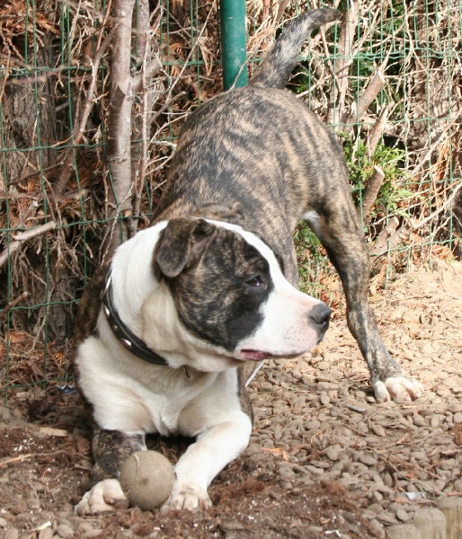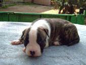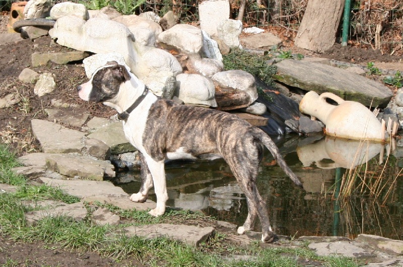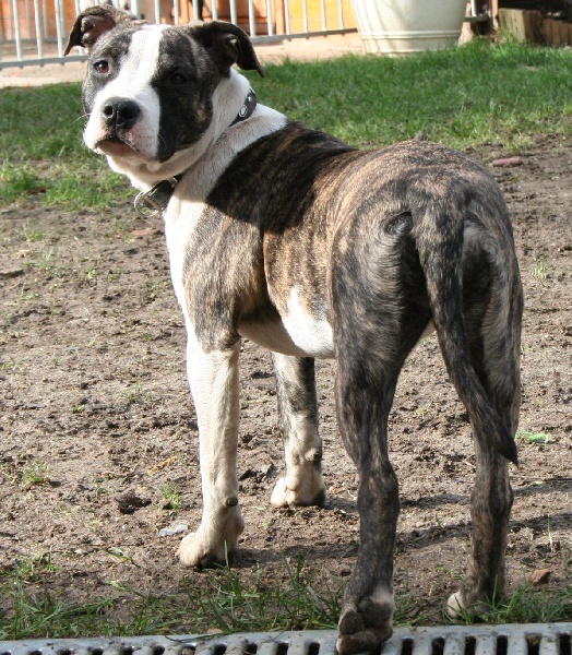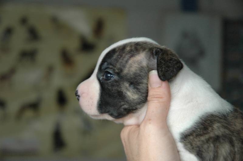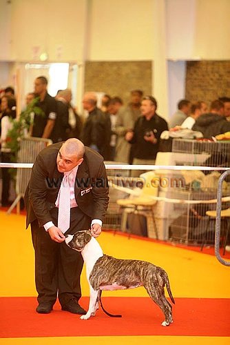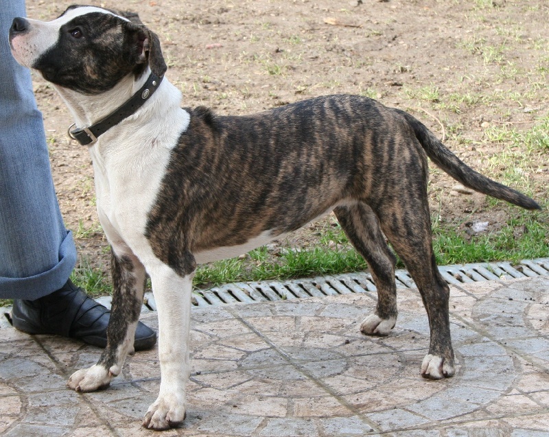 Femelle de 15 mois Bringé et blanc, exc expression et Féminine, exc oeil et oreille, exc ligne de dos, exc attache queue,Pas encore eclaté exc pieds et ossatures, manque un peu d'angulations, exc marche av et arr.Merci encore à Alain de l'avoir presenté comme un chef!