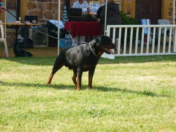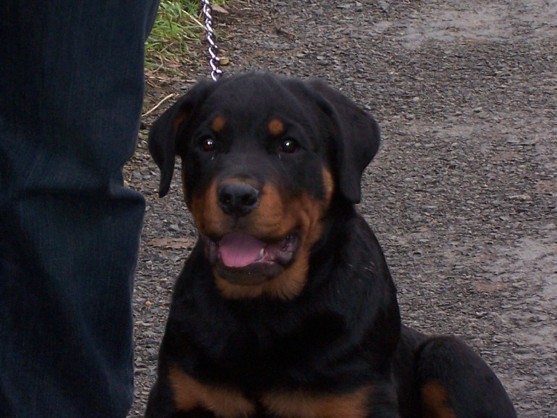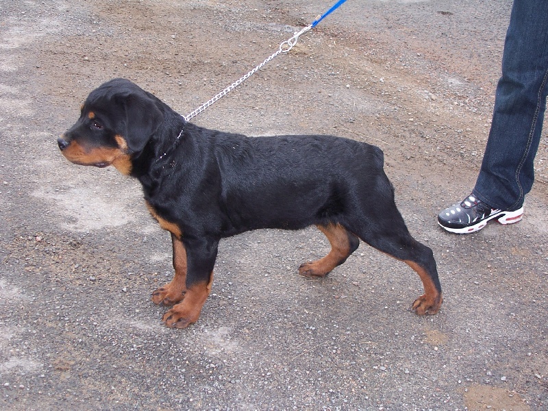 10 mois taille correcte pour l'age bonne couleur feux bien délimite dcc EXCELLENT caractère jolie tète,typique expressive,doit s'élargir,en crane,yeux un peu rond,bonne pigmentation lèvres et gencives encolure puissante,assez sèche,bonne angulation d'épaules,ossature et pieds,poitrail,poitrine déjà correcte dos et croupe exc,bonne angulation,bruce sur le ring d'honneur a fini 3éme meilleur jeune du groupe deux