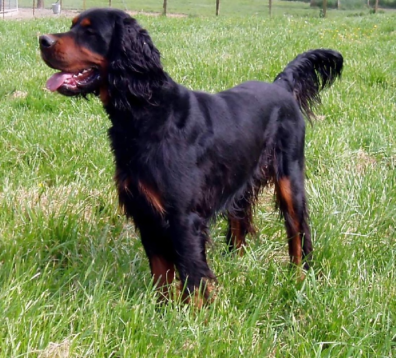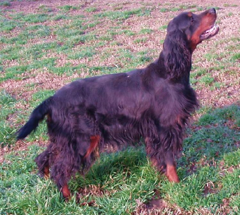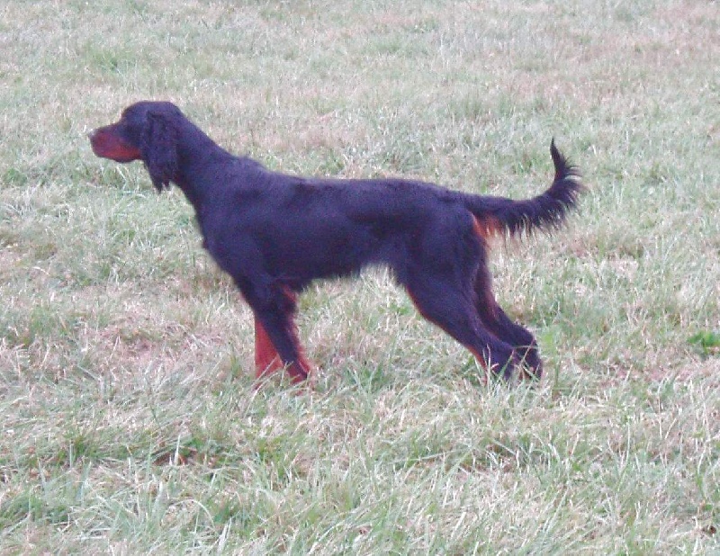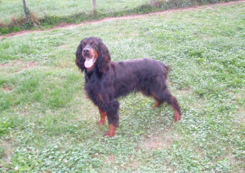 Side of.the.dark. moon est une superbe lice de 62 cm au garrot , très typée , à l'expression "coquine" typique de mes Gordon ! Elle a, bien-sûr été primée dans chaque exposition où elle s'est montrée, mais très peu puisque je ne peux plus beaucoup me déplacer. Elle a d'autre part un "nez d'enfer " et m'aide à retrouver les cailles que les chiots se sont fait un plaisir de disperser! Elle est agée de 5ans et demi et vient de produire sa 2ème portée ....3 petits mâles sont encore disponibles; photos suivront !! Sa portée précédente vient d'avoir 3 ans et les sujets que j'ai revu sont magnifiques et très chasseurs.