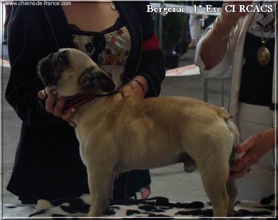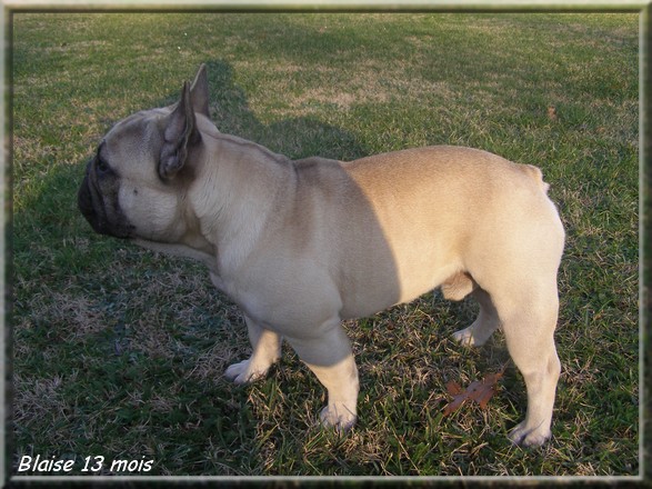 Joli bébé, 6 mois compact. Déjà bien développé pour son âge. Jolie tête, Stop bien marqué, Crâne large front bien bombé, Truffe noir, narines bien ouvertes, dentition correctes en période de croissance, lèvres épaisses bien pigmentées, yeux de bonne forme, bonne couleur. Oreilles attachées haut, bien implantées. Encolure bien musclée. Excellente ligne de dos. Bonne attache de queue.Poitrine assez large et descendu pour son âge. Excellente avant main, excellent arrière main. Doigts bien serrés, ongles solides.Excellent présentation. Excellent caractère.Angulation assez prononcées Mouvement typique.