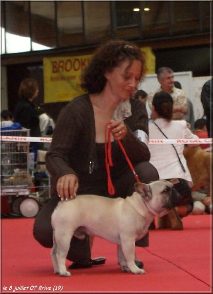 Exc type x exp, bonne tête narine pourrait ê 1 + ouverte, oreilles b placées, chien bien cob, b construit dans l'ensemble, fouet correct pas encore éclaté, bonne poitrine, Exc aplombs x ang, exc allures.