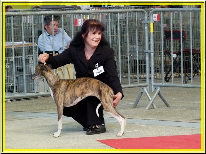 Bon rapport en tête, expression féminine, menton pourrait etre plus marqué, sortie encolure suffisante, angulation épaule un peu ouverte, bonne hauteur de poitrine, rein très marqué, arrière main correcte, mouvement bien au sol, pourraient être plus couvrant
