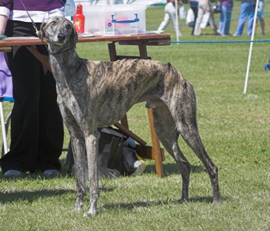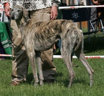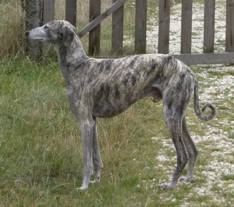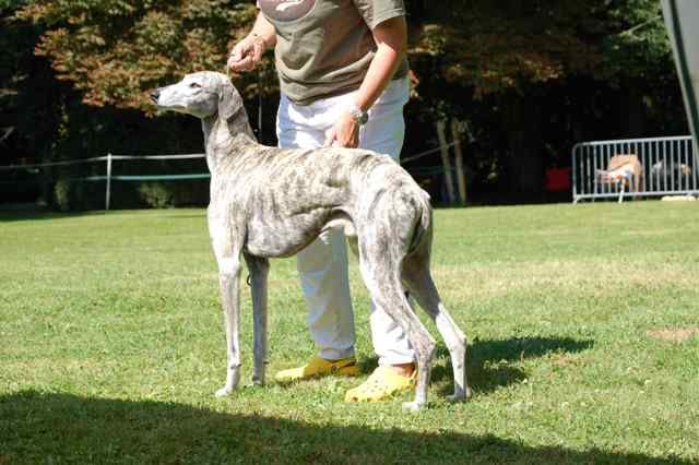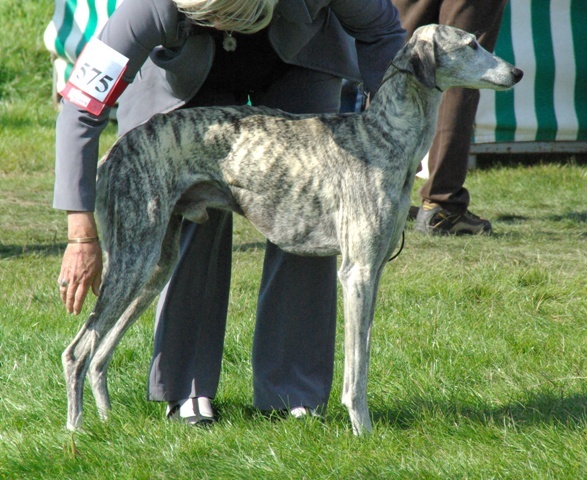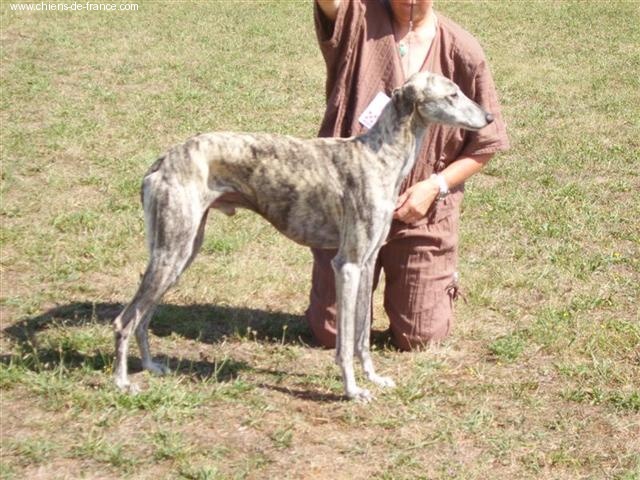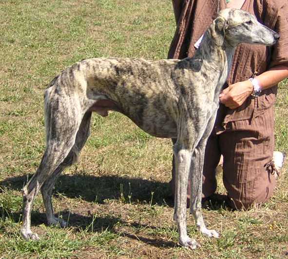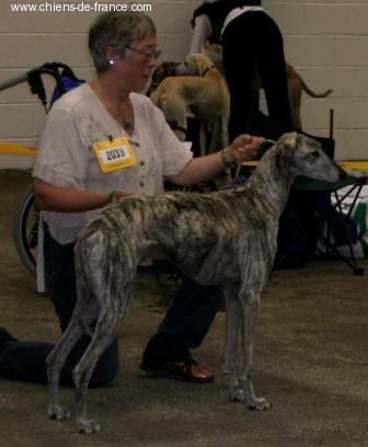 68cms, 2 ans et demi, exc proportions H/L, ossature un peu fine, DCC, exc ang, épaule bien inclinée, exc morphologie tête, oeil ambré un peu triste, fauve bringé, démarche bien perpendiculaire au sol, exc prise de terrain