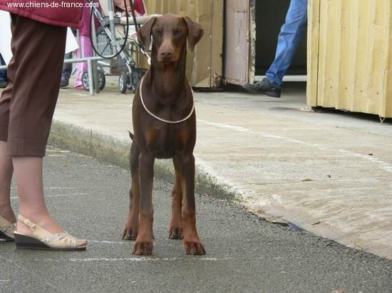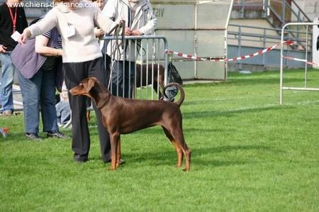 TETE: expressive1) Denture: ciseaux; blanche2) Structure:Os occipital: normalOs frontal: normalStop: normalChanfrein: normalParallèlisme: satisfaisantTruffe: marronMâchoire inf. : normaleOeil: noisetteOreilles: plaquéesCORPS:1) Encolure; bien2) LIGNE DE DESSUS :Dos: correcteCroupe: bonneQueue: bien placée3) Poitrine: bien arrondie4) Ligne de dessous: bien arquéeAVANT MAIN:1) Poitrail: ouvert2) Epaule: bien angulée3) Aplombs antérieurs: solides face: rectilignes pofil: rectilignespied de chatARRIERE MAIN1) Cuisse: musclée2)Aplomds postérieurs: a) Vue de derrière: jarrets ouvert; canons parallèles b) De profil: assez bien angulés; pied de chatALLURES: correctesROBE a) couleur: uniforme b) poil: ras c) feu : acajou; charbonnés; bien délimitésMORPHOLOGIE GENERALE CorrecteCARACTERE StablePRESENTATION Correcte