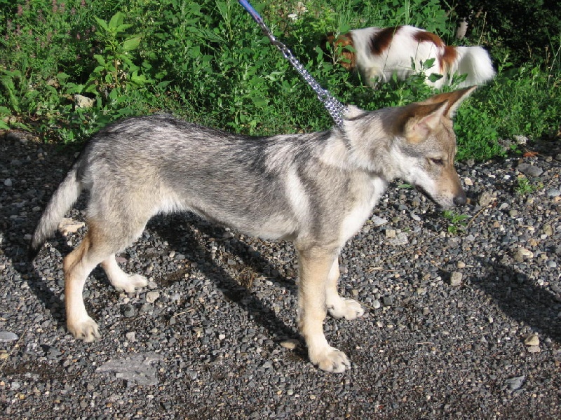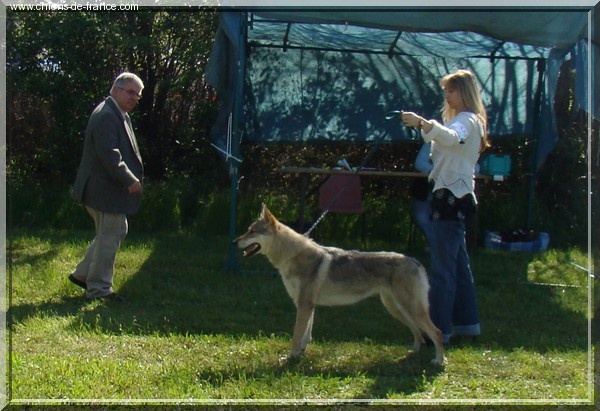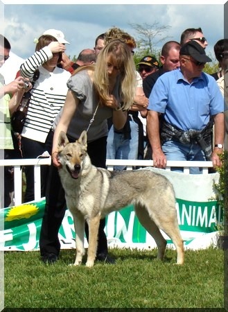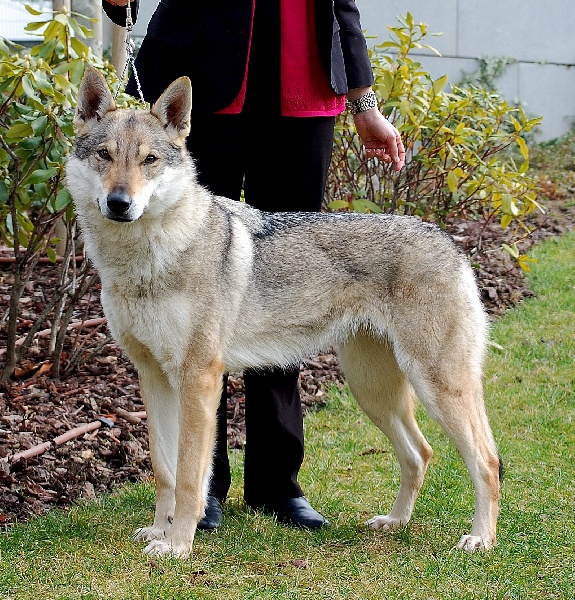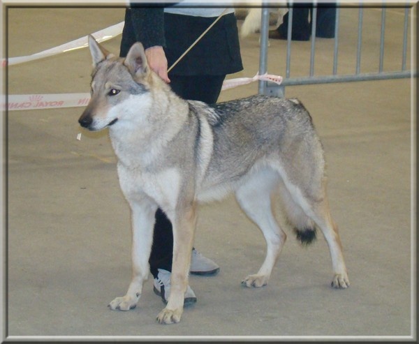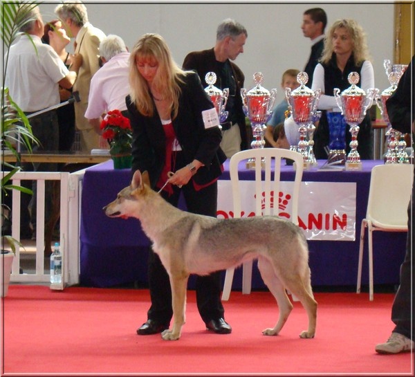 Très joli sujet. Superbe tête très lupoïde. Oeil un peu foncé mais de bonne forme. Exc OR. Belle sortie d'encollure, excellent épaule, excellents aplombs avants et pieds, excellentes antulations arrières, poitrine de très bonne hauteur. Chienne très élégante