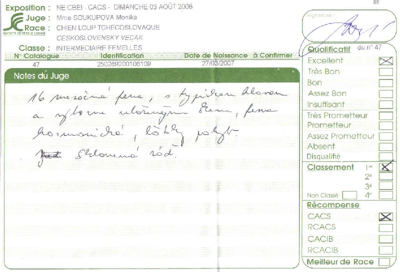 "DCC. Tête bien formée et expressive. Dessus pas encore tendu, en croissance. Très bons aplombs. Angulations correctes. Robe de bonne couleur. Bon comportement. Bonne démarche et bon mouvement."