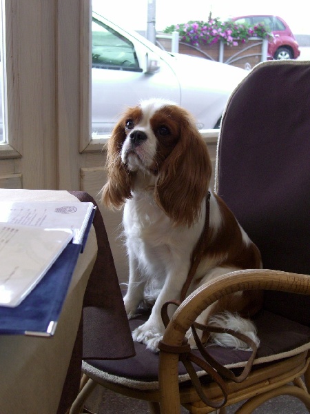 Sublime blenheim avec une tête de rêve. T beaux yeux. Exc pigm. Dentition correcte pour son âge. T belle épaule. La ligne de dos est légèrement souple. Jolie ossature. Jolis pieds. Exc ang à l'arr. Jarrets courts. Présentée en superbe état. T belles robe, franges et texture. Marche T Bien à l'avt et arr. Elle perd un peu sa ligne de dos en profil. Fait honneur à sa race