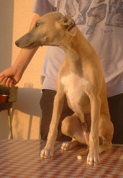 Avec nous, il est charmant, extrêmement obéissant et se fait à toutes les situations. Il aime les grands voyages où là alors, il se comporte de manière exemplaire. Il est super sûr de lui, la preuve en a été son 1 er championnat à Luxembourg, il a été handlé par notre ami et grand éleveur "Bart Sheerens" (qui est depuis peu juge de whippet) et cela ne l'a en aucun cas affolé. Il s'est conduit en parfait "pro" ce qui lui a valu un classement parmi le podium des jeunes.