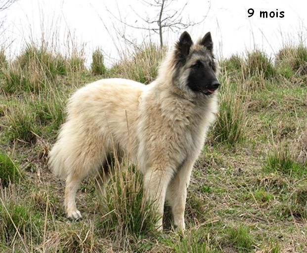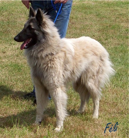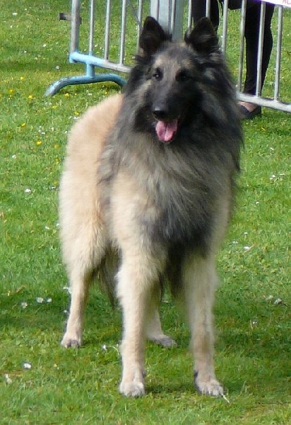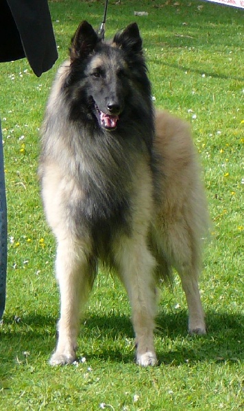 DCP. Grand modèle sable, excellent crane, stop et parallélisme, excellente ciselure, excellent ?il sombre, très bonnes oreilles, encolure dégagée, bonne construction générale courte, excellente poitrine, poitrail correct, angulations équilibrées, jolis pieds, piétine antérieurs et manque amplitude, joli type.