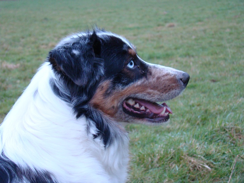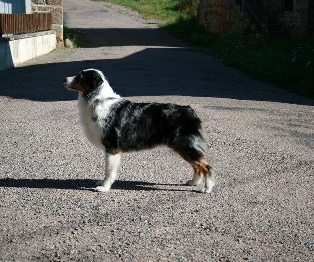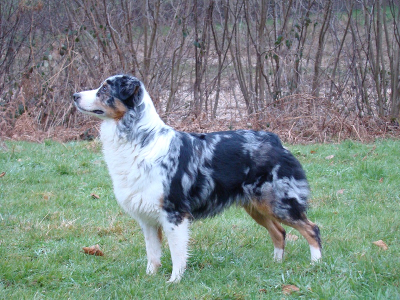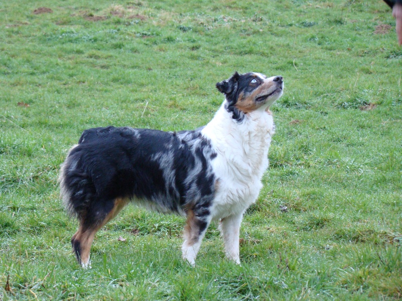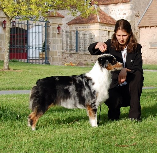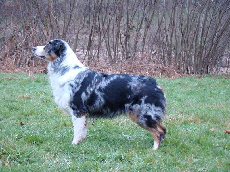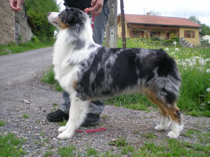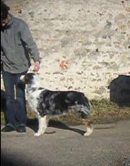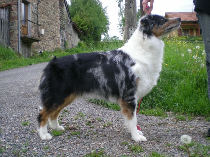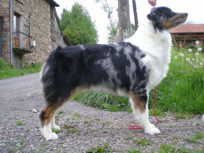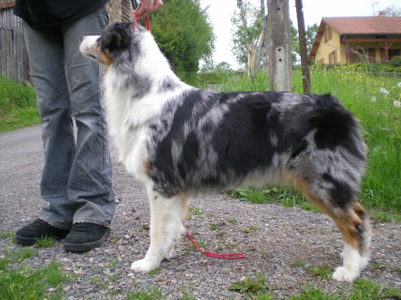 8 mois. bleue merle. Bonne expression. Bonne encolure. Bonne denture. Bonne proportions. Excellents yeux et oreilles. Construction bien proportionnée. Ossature moyenne. Epaule et arrière main un peu justes. légèrement panard avant/arrière. écarte légèrment les coudes. manque de poussée.