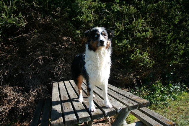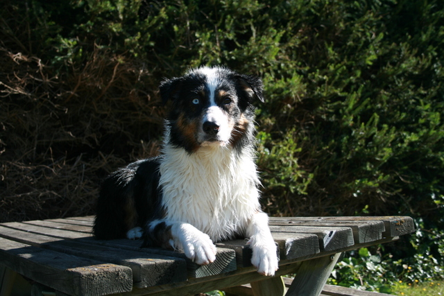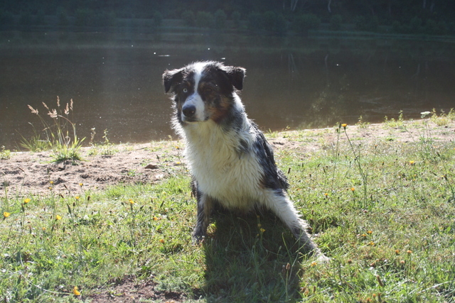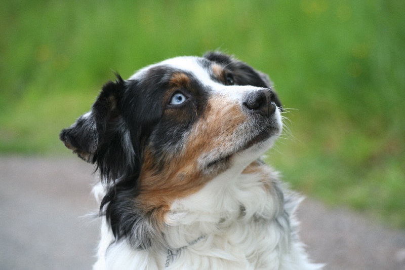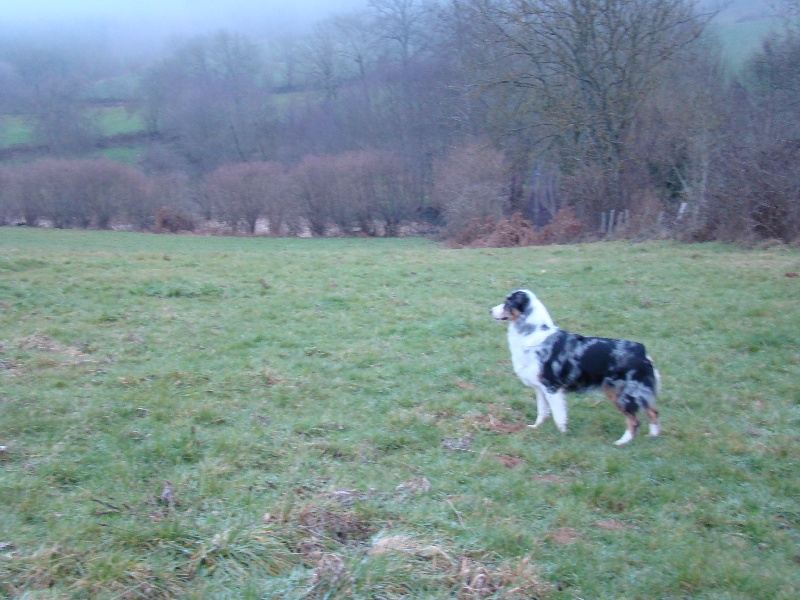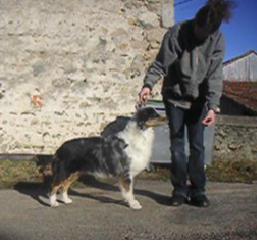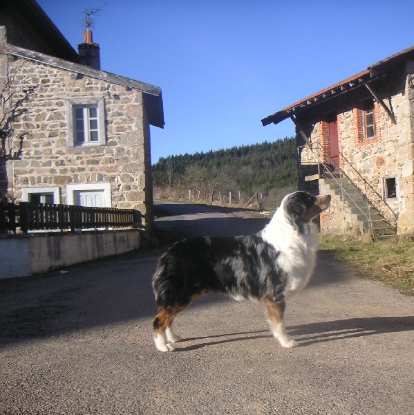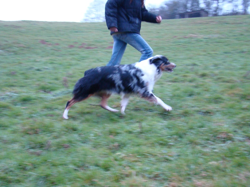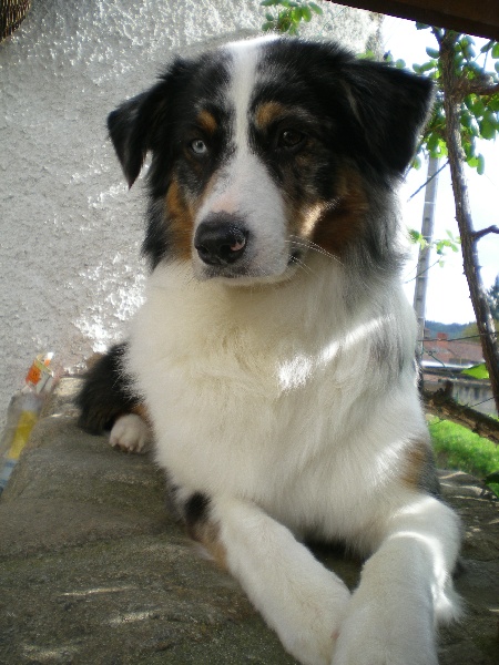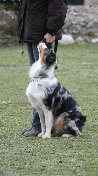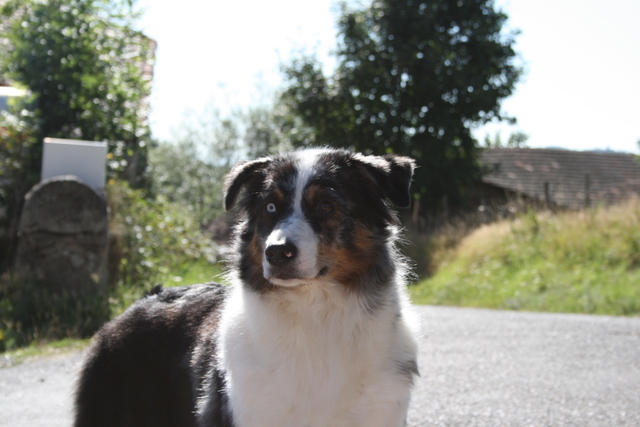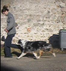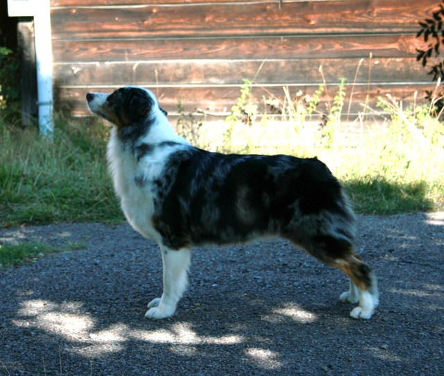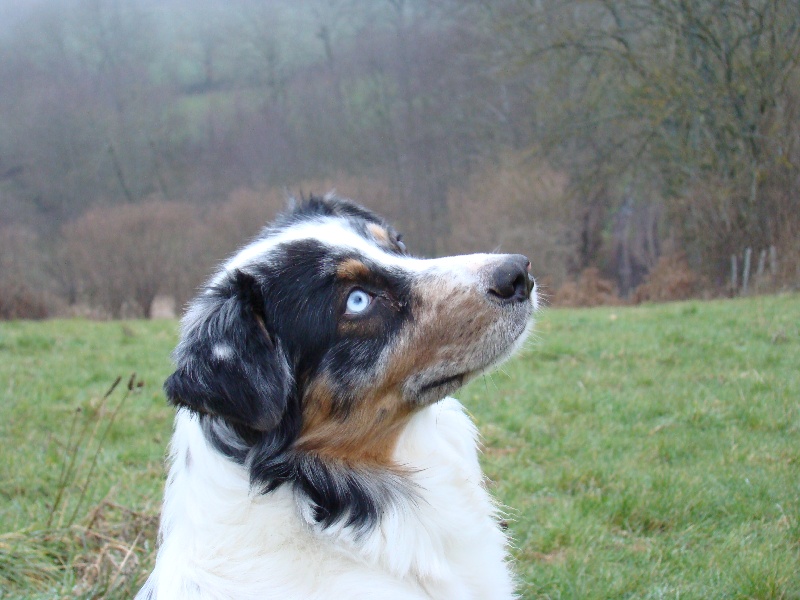 8 mois. bleue merle. Bonne expression. Bonne encolure. Bonne denture. Bonne proportions. Excellents yeux et oreilles. Construction bien proportionnée. Ossature moyenne. Epaule et arrière main un peu justes. légèrement panard avant/arrière. écarte légèrment les coudes. manque de poussée.