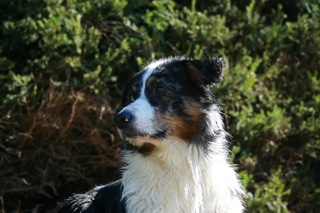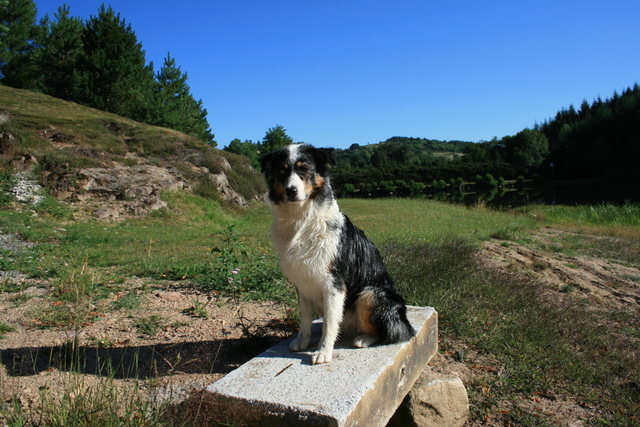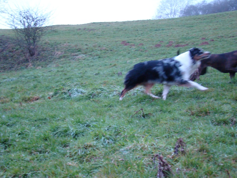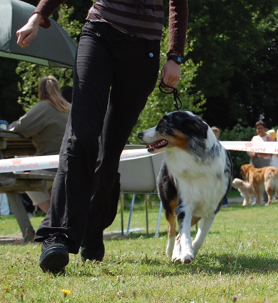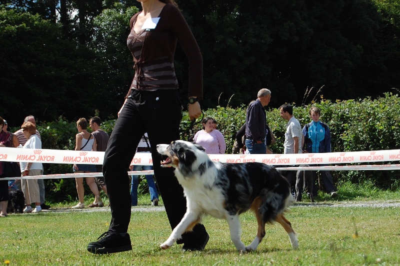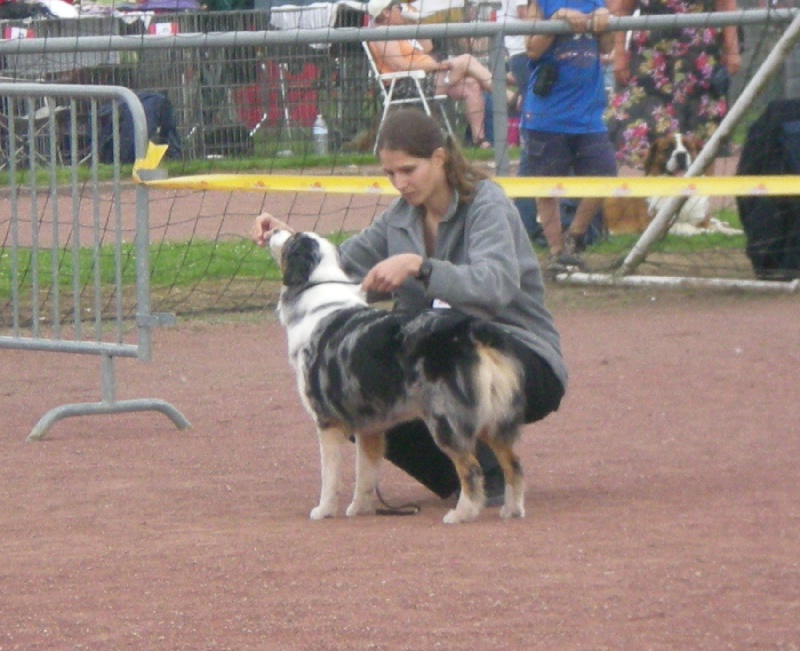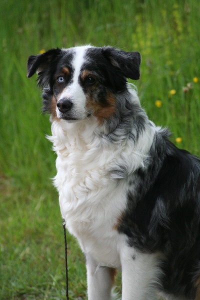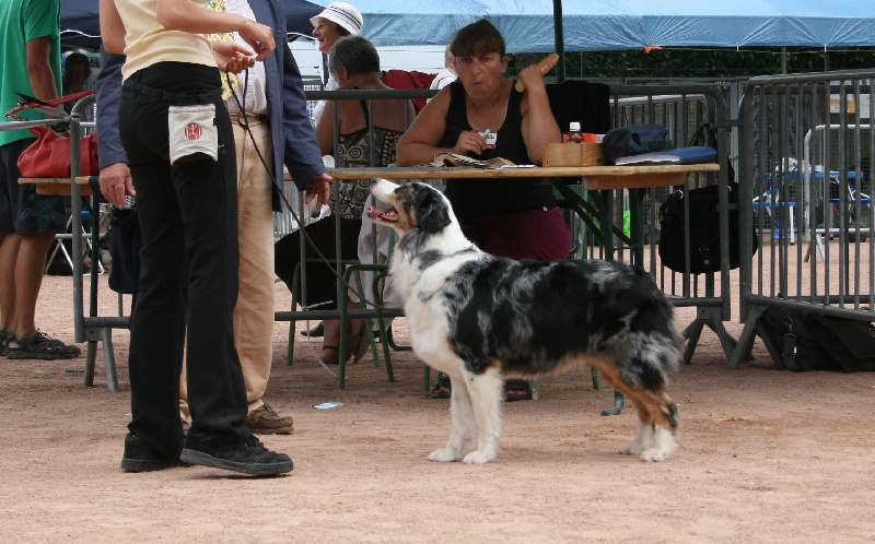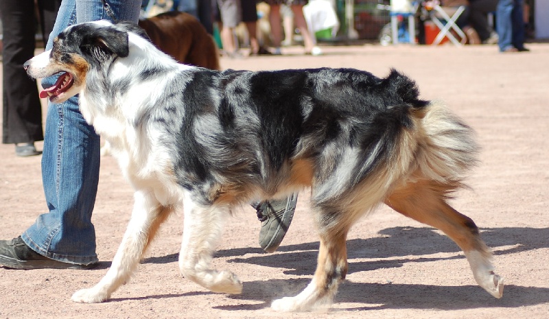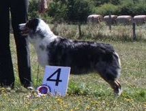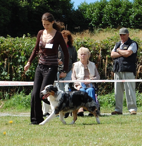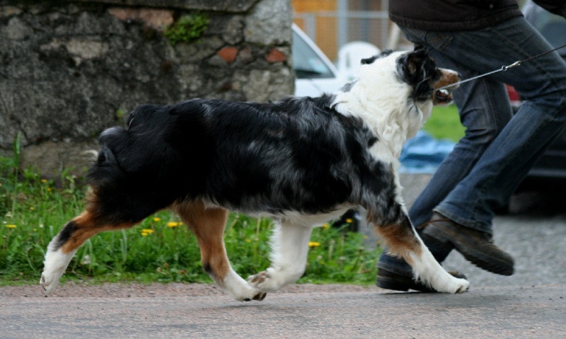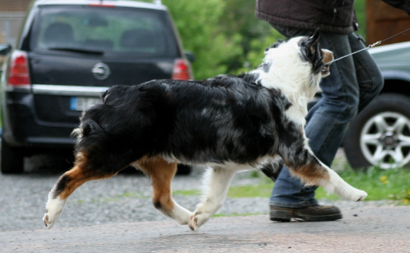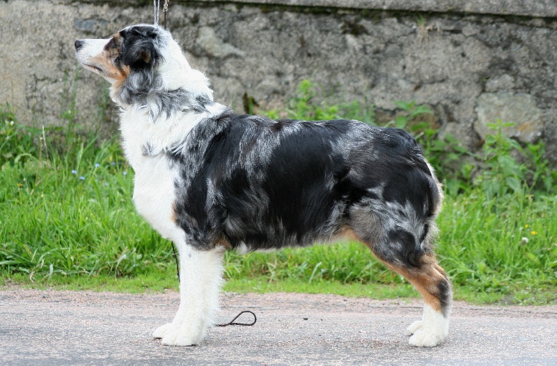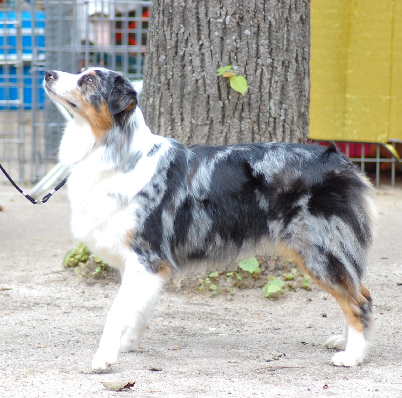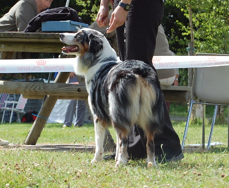 DCC. Ensemble bien construit. Très bon crâne. Oreilles bien implantées. Chanfrein un peu fin. Très bonne encolure. Dessus régulier. Rein large et court. Bon volume de poitrine. Très bons applombs et angulations. Taille moyenne. Manque un peu de puissance. Robe merle tricolore. Léger manque de pigmentation au nez. Bonne démarche.