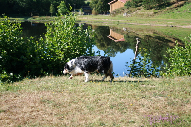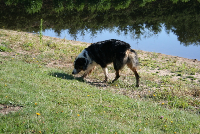 Bleue merle de 23 mois. DCC. Belle denture. Excellente coaptation des machoires. Yeux vairons. Tête aux bons rapports. Pourrait avoir un peu plus de menton. Très bonne encolure. Dos suffisament tendu. Excellente poitrine. Très bonne croupe. Aplombs réguliers naturels. Bonne ossature. Bon mouvements réguliers. Très jeune dans son allure générale. doit prendre de la maturité.