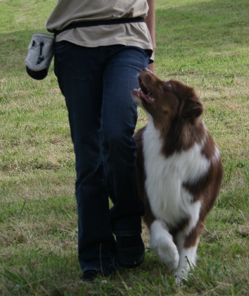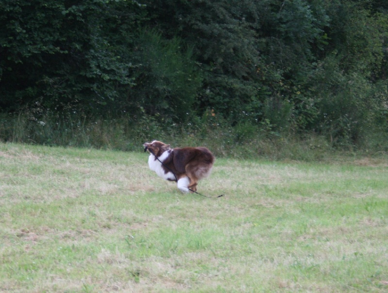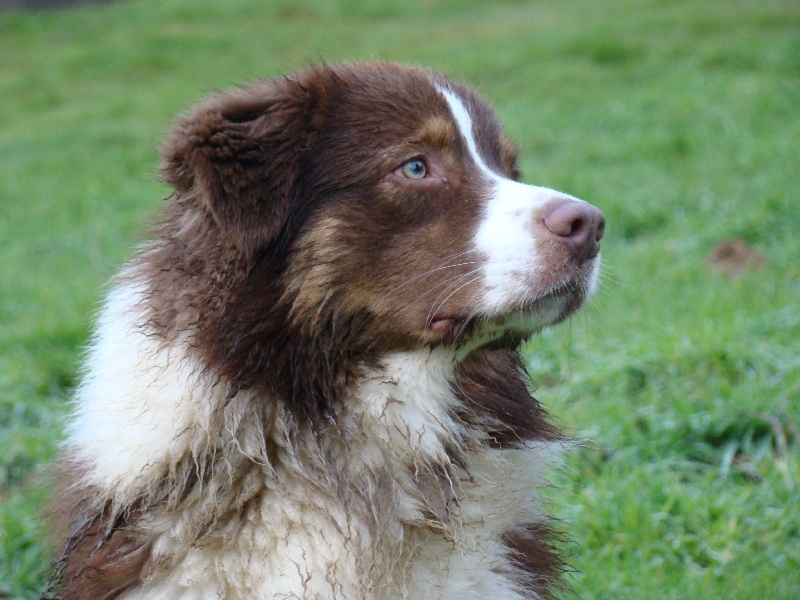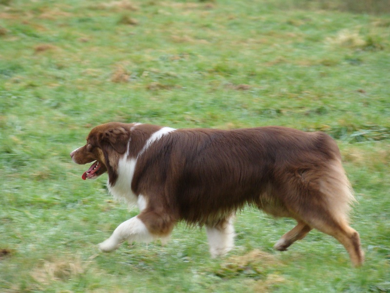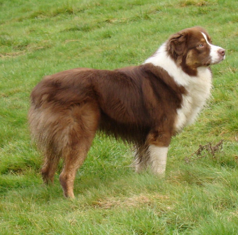 Joli sujet bien construit. Je souhaiterais le corps un peu moins ramassé, mais excellent mouvement latéral. Belle tête et expression. Bien typé. DCC. Belle fourrure. Marche bien.
