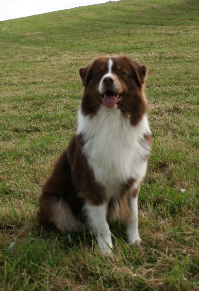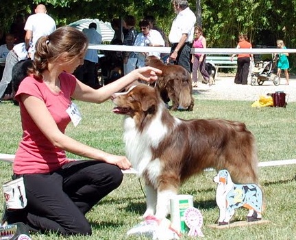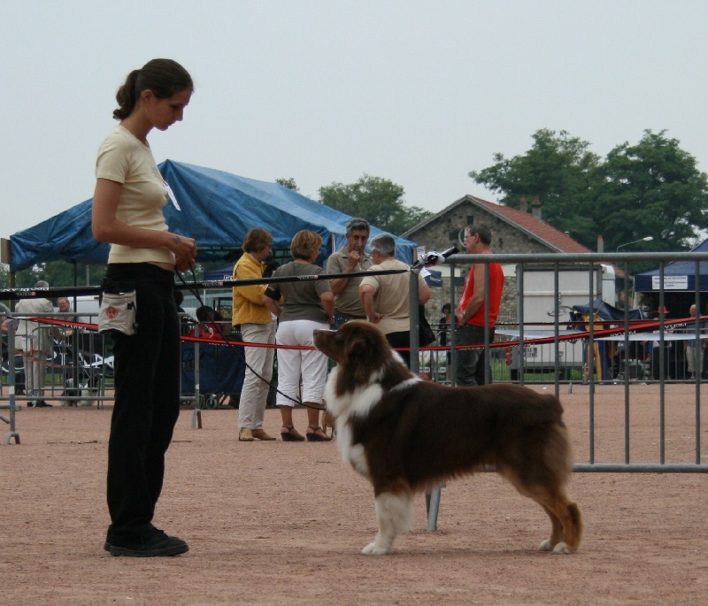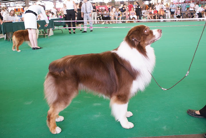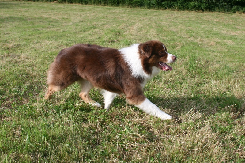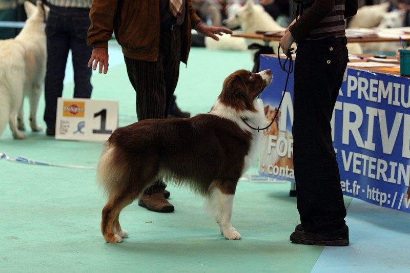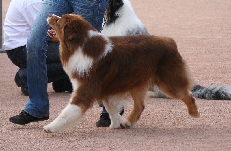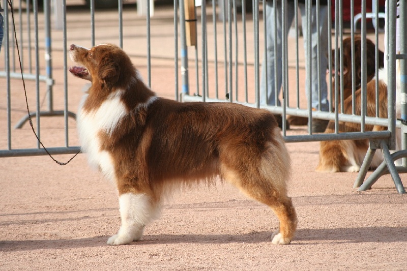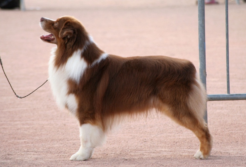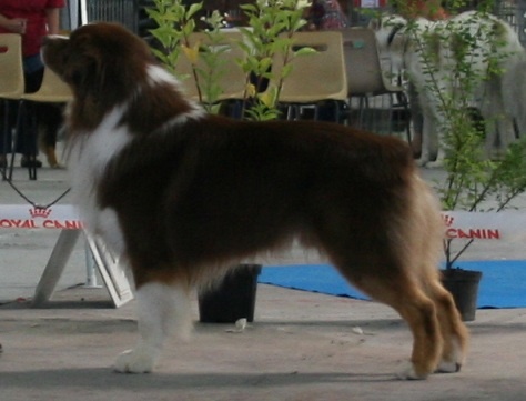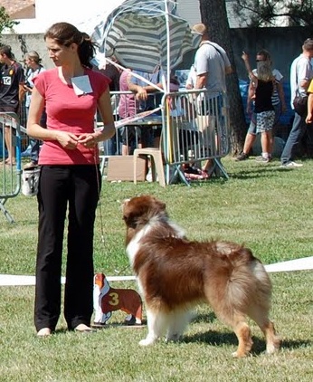 Excellent ensemble très harmonieux.Jolie tête et expression.Bien construit dans son ensemble.Très bonne ossature.Applombs et angulations corrects.Se présente très bien.Excellent poil.Excellent mouvement.Serre un peu des postérieurs en mouvement.