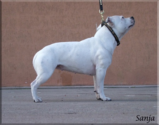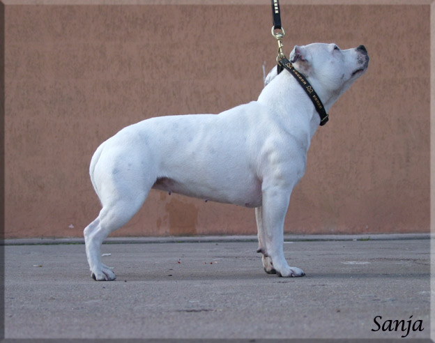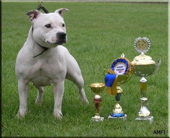 Tres belles proportion en tete, sujet blanc, exc pimentations des muqueuses, oreilles pourraient etre mieux porter, mucles jugaux tres developpes, tres bonne ligne de dessus, exc cotes et poitrine, exc angulations avants et arrieres, mouvement actif et parallele.