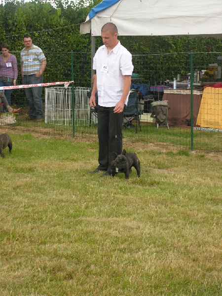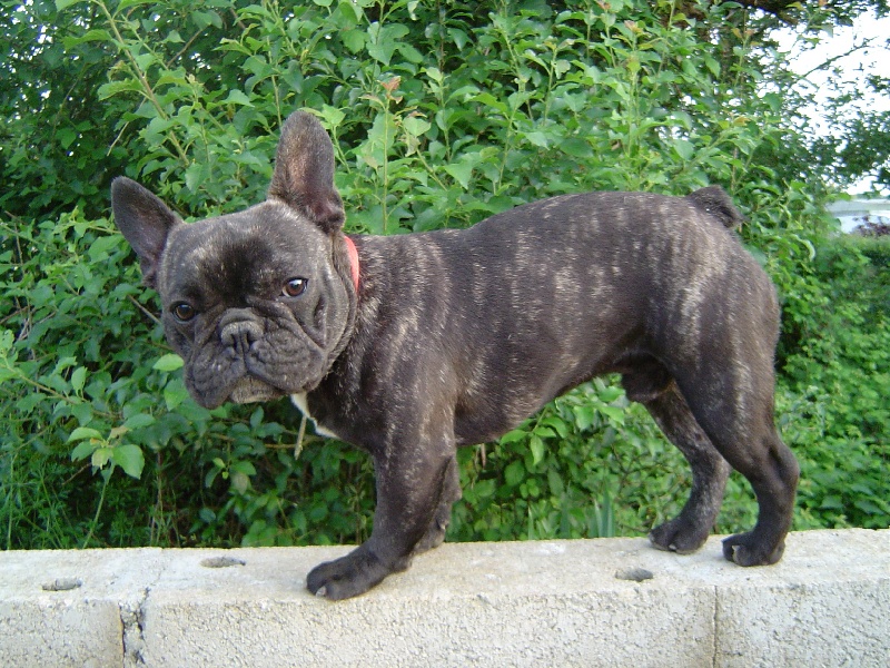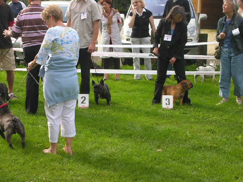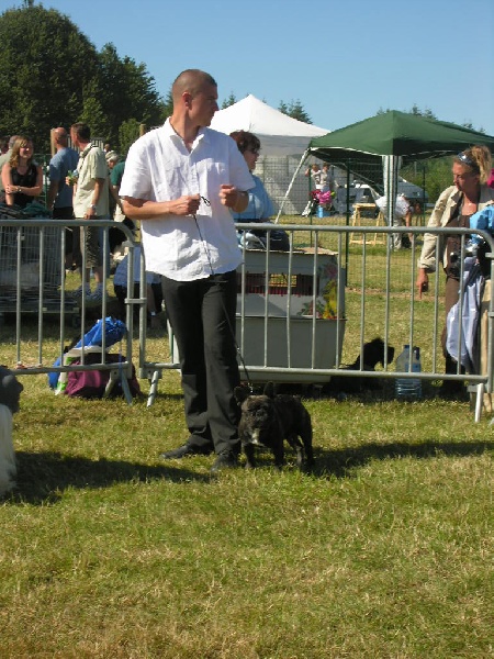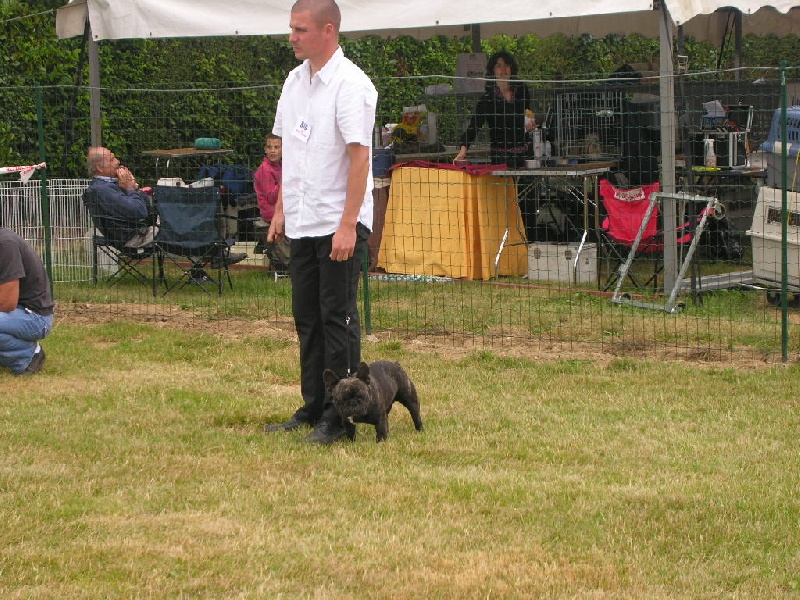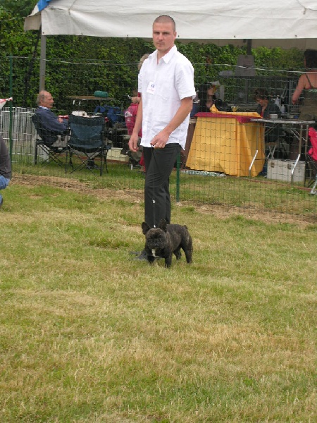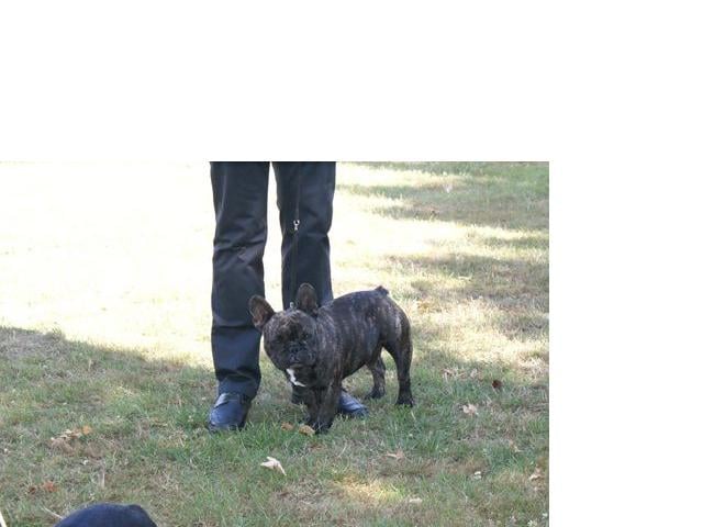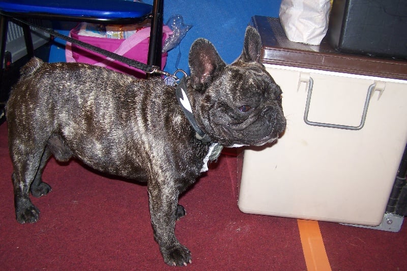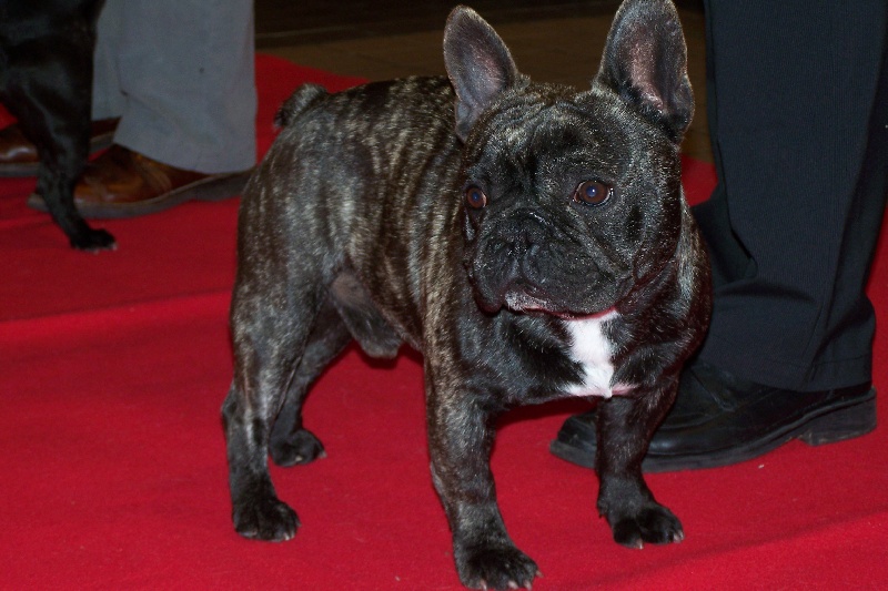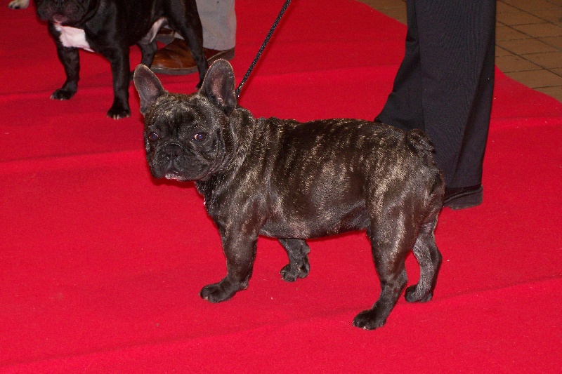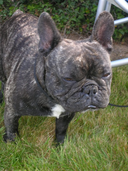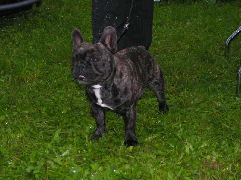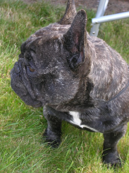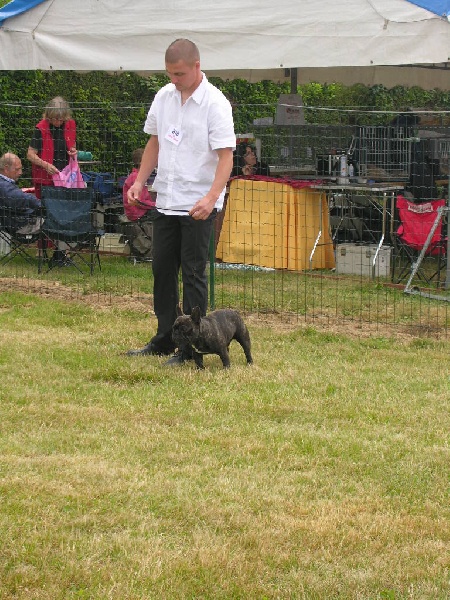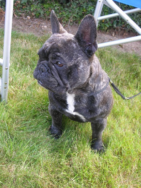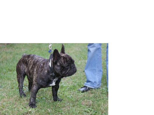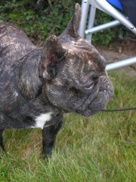 Exc aspect général, dos de carpe exc. Exc grosse tête carrée, REM correct, belles narines, progn correct. A du menton ! Reins courts, bonne poitrine bien cylindrique. Complet, poitrail bien ouvert, ant //, bringé parfait, exc oreilles.Croise léger des post à la marche. MEILLEUR MALE