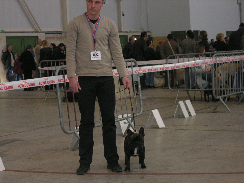 12kg500, bon articulé. Chien bien construit dans son ensemble manquant de substance. Exc couleur oeil. Bon crâne. Griffes claires. Poitrine pourrait être 1 peu plus dvpée. Queue implantée un peu haut, 3 vertèbres. Roach back correct. Trés jolie couleur. Démarche correcte manque de poussée et d'allures vives.
