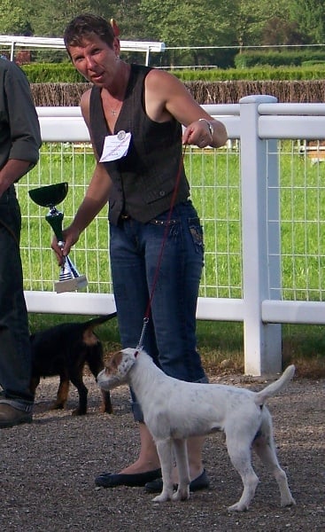 Poil dur, 37/40, jolie tête, excellent DCC, quelques tavelures sur la peau, bien équilibré dans sa construction mais encore un peu léger, la poitrine pourrait être un peu plus descendue, très belle arrière-main, excellent aplombs et pieds, marche correctement