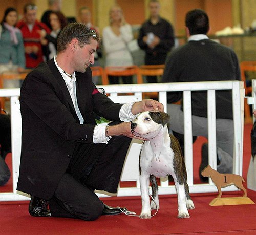 "BOBO" de son petit nom, c est un amour de chien....un vrai papillon tout le monde il est beau, il est gentil avec lui...la joie de vivre en personne, debordant d affection, de betises, il est notre rayon de soleil quotidient...il comprend tout de suite ce que l on attend de lui...il aime jouer la star des rings et ce ptit bout de choux fera parler de lui tres prochainement et pendant tres longtemps...si tous les amstaffs etaient comme notre bobo , cette si belle race n aurait jamais fait la une des medias...une chose est sure tu fais la une de notre coeur....