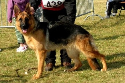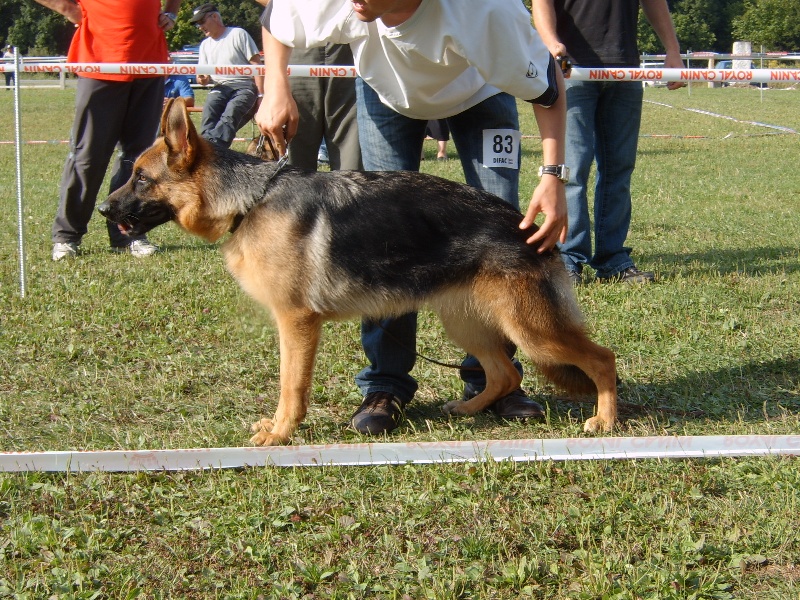 Merci au Conducteur. - à 9 mois tout juste, COMMENTAIRES DU JUGE:Grande chienne, puissante, avec une tête très puissante, un bon garrot et une bonne ligne de dos.La croupe est un peu inclinée, les angulations sont bonnes, la face frontale est droite. Les foulées sont amples.