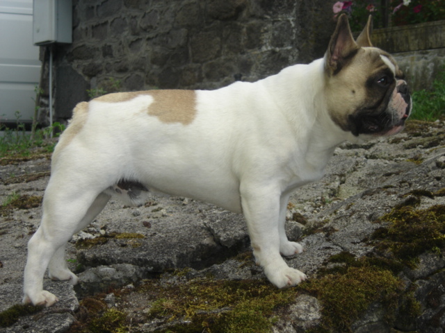 Mouvement correct. se présente bien. Belle construction solide. Belle forme de crâne. Oreille bonne forme portée un peu de côté. L'oeil excellent, forme et couleur. Masseter un peu chargé. Narine correcte. Menton large bien éclaté. Prognatisme + +. Tête un peu lourde. Excellent épaules, excellent ossature. Pieds corrects. Excellent forme de côte. Roachback pourrait être plus marqué. Queue 1 vertèbre.
