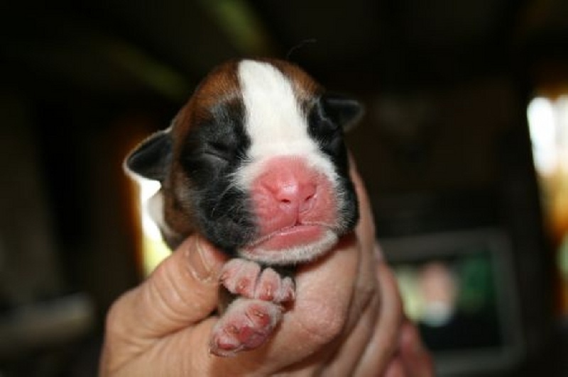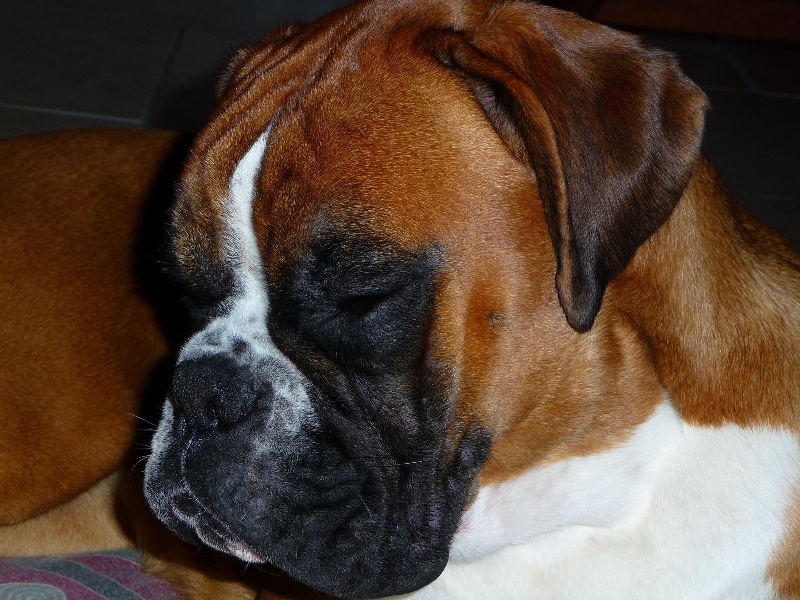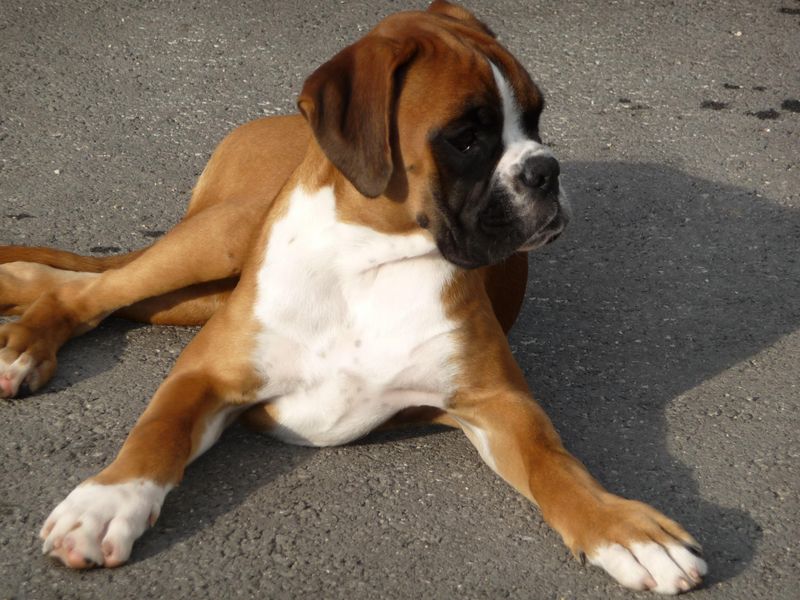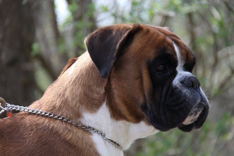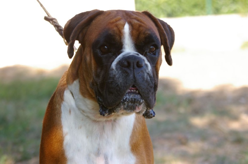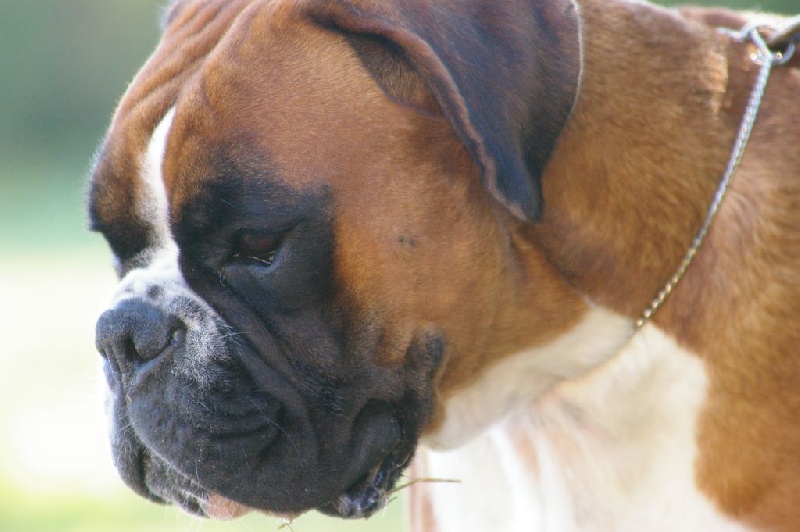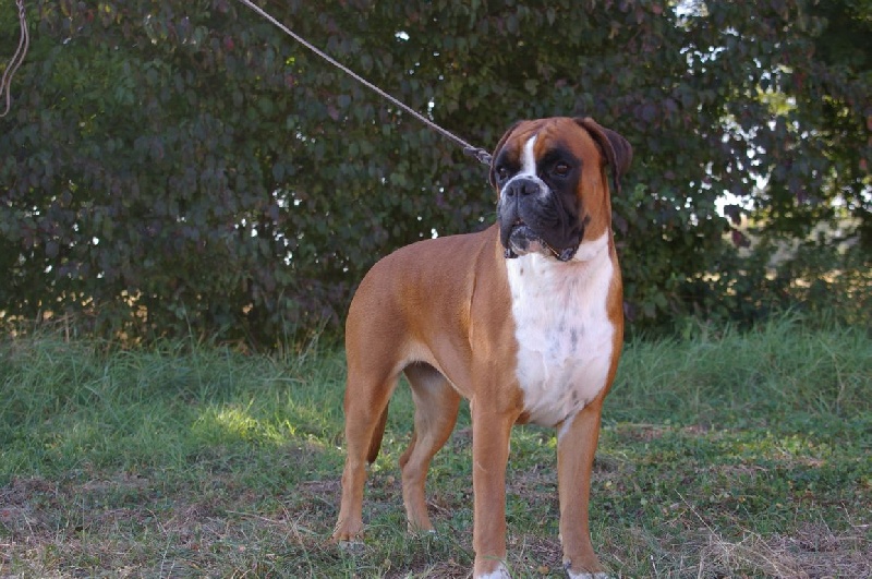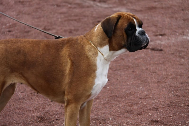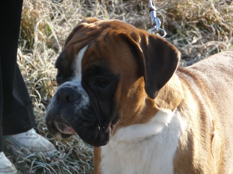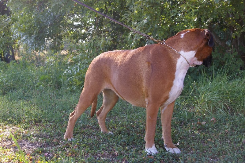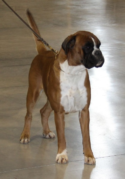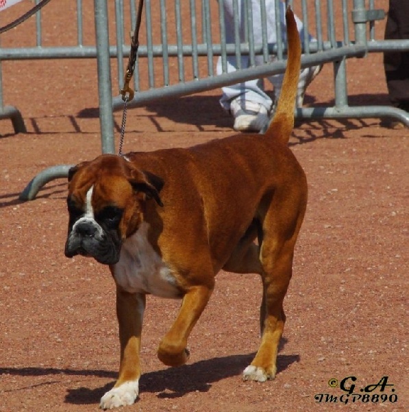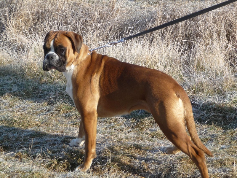 3 ans, fauve marquée en blanc.Très bon type de tête. Denture moy. large avec exc. prognathisme. TB yeux par la forme et par la couleur. Encolure puissante. Exc. poitrine et poitrail. TB angulations AV/AR.