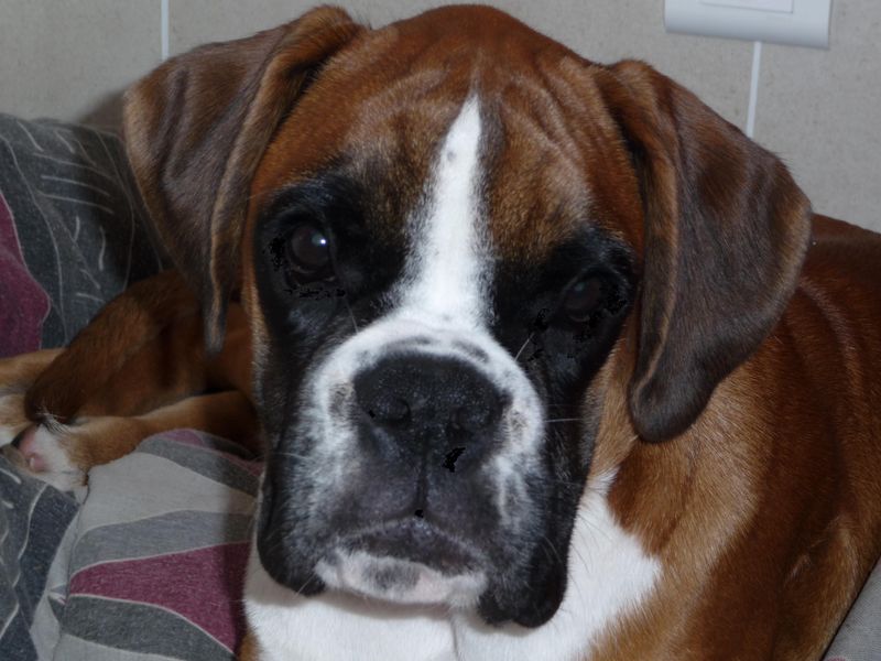 Silhouette B féminine. TB rapport crâne/museau. Truffe un peu remouchée. Exc denture et mandibule. Oeil foncé. TB expression. Corps TB proportionné avec poitrail et poitrine B en place. la croupe est légèrement avalée. Ossature forte TB aplombs angul et pieds. Exc poil robe masqueTB poussée. Le dos est meilleur pendant le mouvement