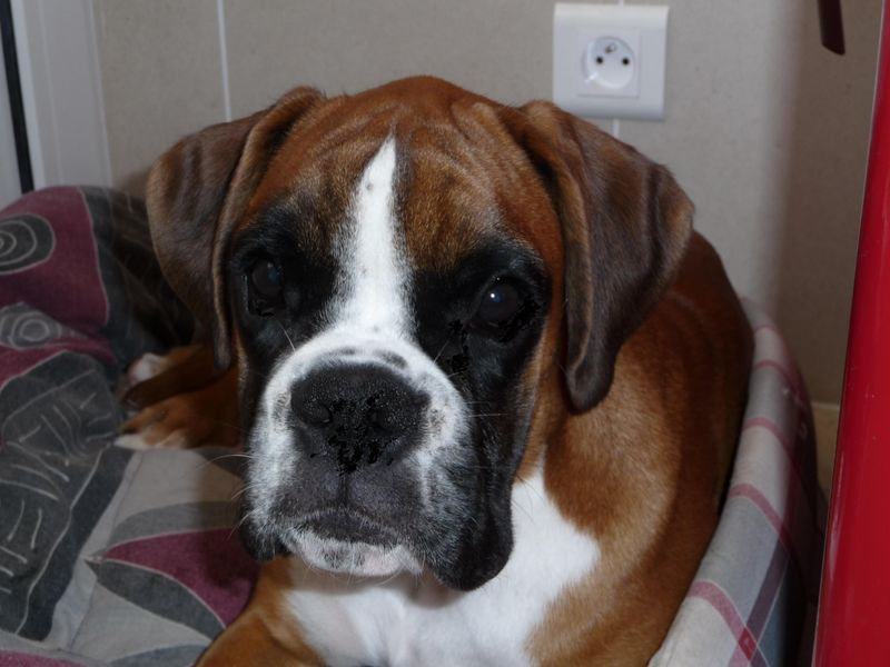 6 mois. Grande. Carrée. Bonne ossature. Très bonne ligne de dos. Cou long. Élégante. Tête typique. Museau large avec bon menton. Yeux sombre. Bonne bouche . Bonne angulations AV AR. Bon mouvement.