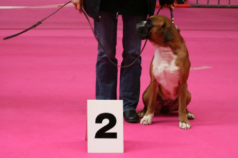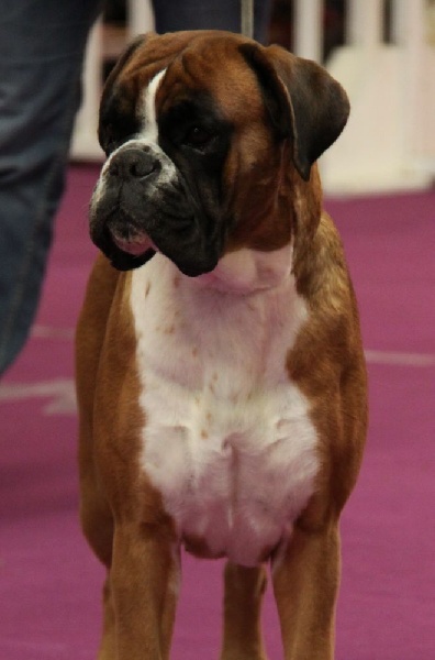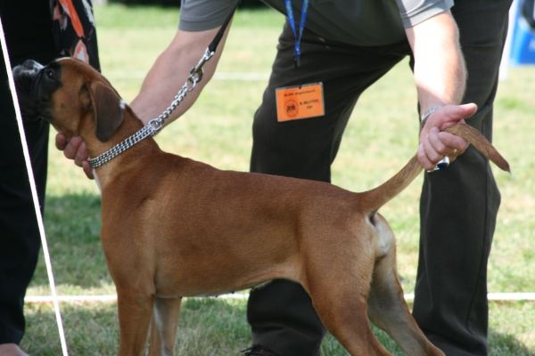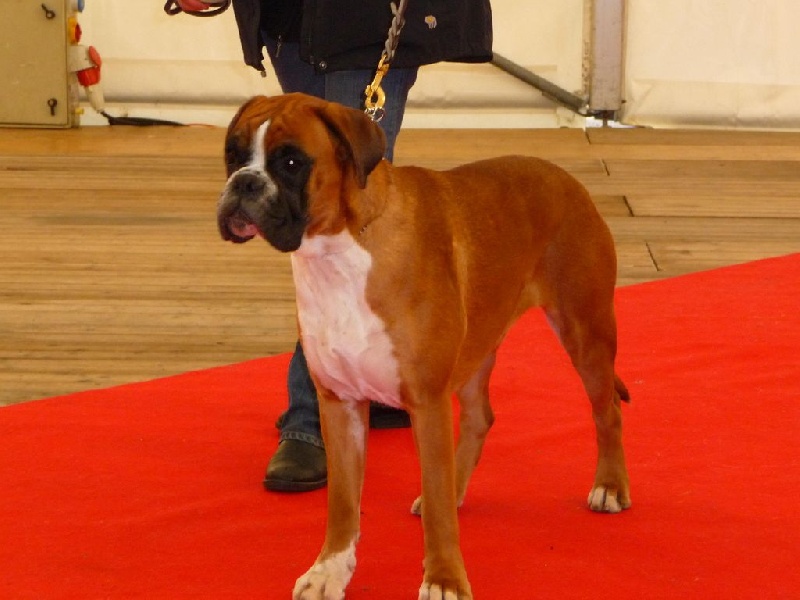 "Excellent chien dans l'ensemble, bien musclé, très jolie tête, stop bien marqué, crâne bien cubique.Narines bien ouvertes.Yeux : bonne forme et couleur.Encolure : bonne longueur et bien musclée.Excellent dos /poitrine/épaules/côtes/reins.Cuisses bien musclées.Angulations arrières bien marquées.Excellent caractère et présentation"