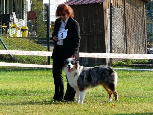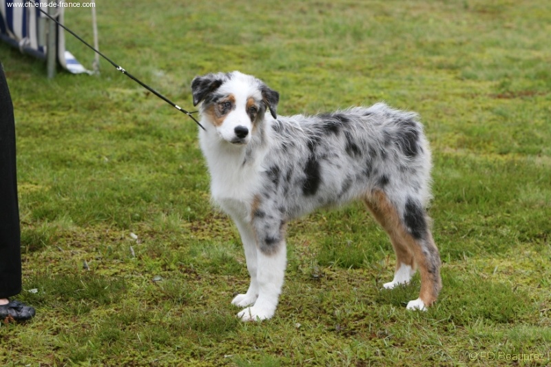 bleu merle, très beau sujet bien dans le type avec d'excellentes proportions, une belle ossature et d'excellents aplombs et angulations; très bonne poitrine, excellent mouvement, bonne prise de terrain
