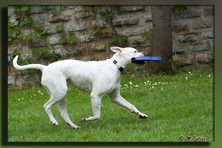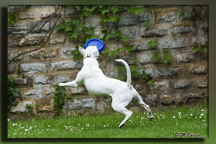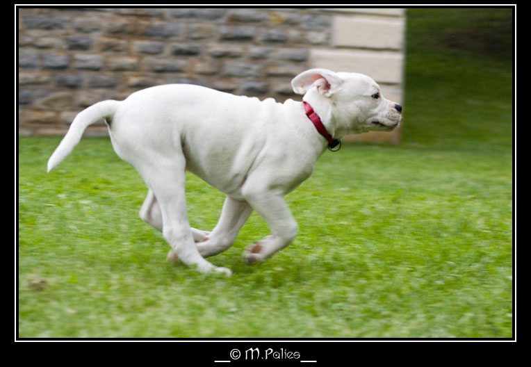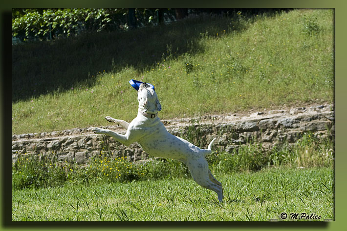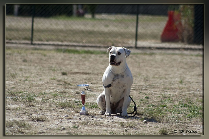 Pleine d'entrain c'est une chienne qui ne demande qu'à apprendre et qui s'éclate à fond lors d'exercices d'obéissance et de jeux ludiques .