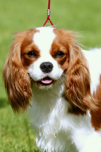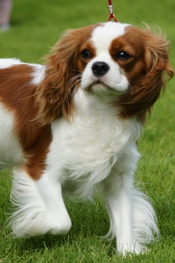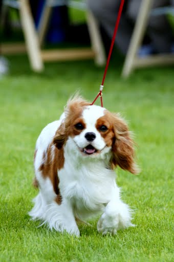 Well marked blenheim,good coat colour.Dark eye,good nose pigment,pretty head,good sile and shape.She moved happily.