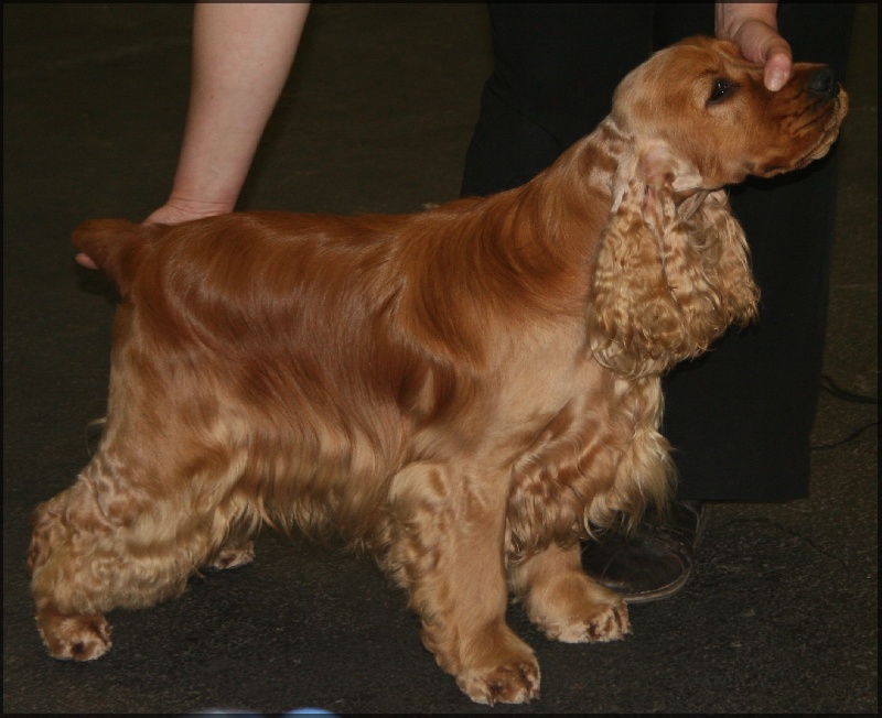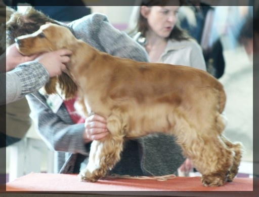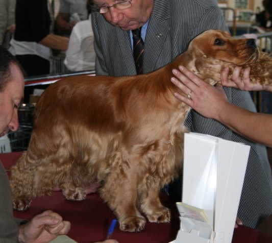 Ligne en tête pourrait être legèrement plus parallèles.Très bel oeil .Bonne attache d'oreille et longueur.Bonne denture DCC.Excellente ossature.Bons pieds et épaules.Excellente poitrine.Bonne angulation arrière.Bonne attache de fouet.Bonne démarche, AV AR et profil.