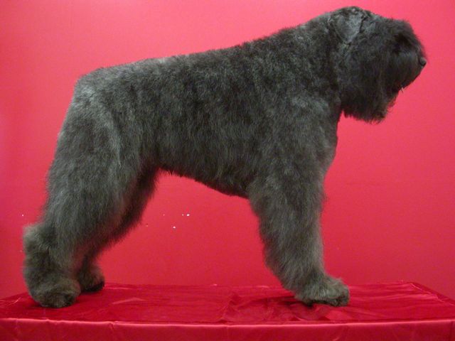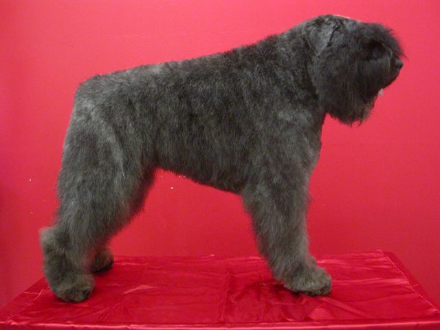 2ÈME EXCELLENT, CLASSE OUVERTE MÄLE. Chien de bonne taille d'exc proportions avec un corps bien court une ligne de dos bien tendue et une exc poitrine. Exc angulations. TB aplombs arrière. Encolure un peut courte. La tête apparait joufflue à cause de l'excès de poils. Les proportions de tête sont néanmoins bonnes et le regard bien typique avec un oeil foncé. DCC. Robe grise de très bonne texture et d'aspect bien mat. Donne une impression de lourdeur aux allures qui néanmoins sont équilibrées. La couverture du terrain est bonne. Chien très sage peut être un peut trop. Présenté en exc condition physique.