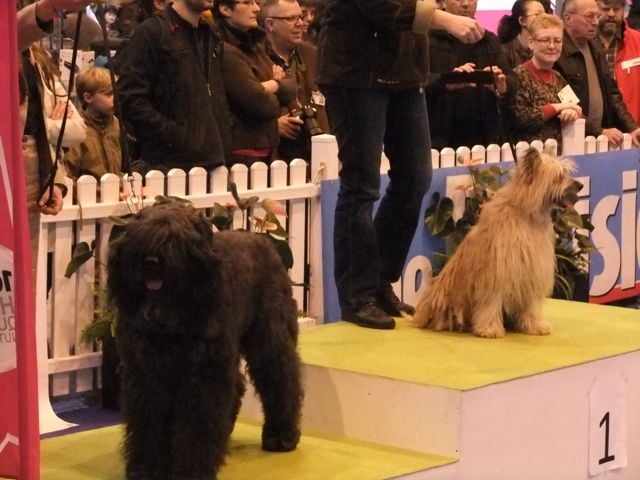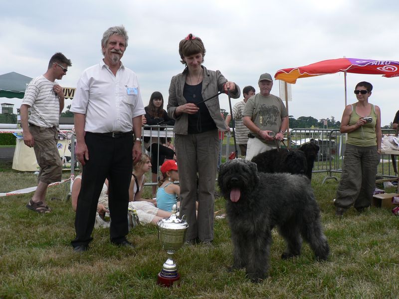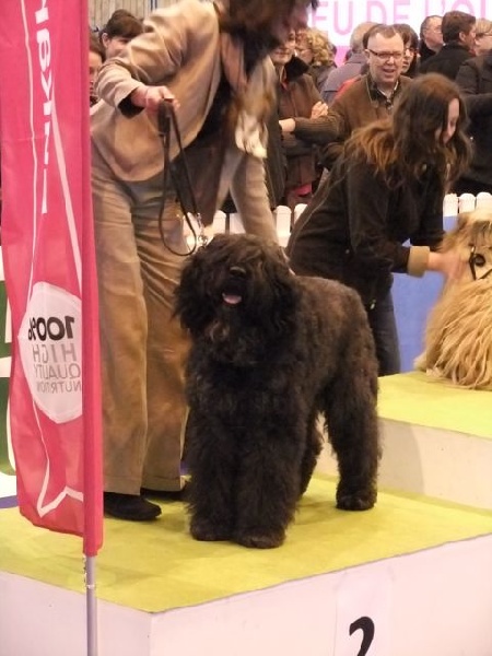 EXCELLENT, 1er classe intermédiaire mâle, CACS, BOB (Meilleur de race avec 45 bouviers présent!) 3eme du Groupe 1.Exc format bien court, DCC Exc qualité tête-oeil-pigmentation-encolure, Exc ligne dessus-dessous, complet, Exc croupe, Exc angulations avant arriere, Exc poitrine poitrail, Exc aplombs avant-arrière, Exc poils, Exc allure