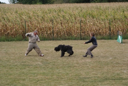 -SUITE EN LAISSE : 3 sur 4, traine et s'écarte.-REFUS D'APPATS : 9,5 sur 10, un commandement de mise en place supplémentaire.-SUITE SANS LAISSE (chien muselé) : 0 sur 10, le chien interrompt l'exercice.-MINUTE D'ABSENCE (chien couché) : 10 sur 10.-DEFENCE DU CONDUCTEUR (2 coups de feu) : 24 sur 30, tarde à défendre 1s, 1 commandement supplémentaire de cessation.-ATTAQUE DE FACE (30m invariablement) RAPPEL AU PIED : 30 sur 30-TOTAL : 76,5 sur 92-ALLURE GENERALE : 6,45 sur 8-TOTAL DES POINTS : 82,95 SUR 100