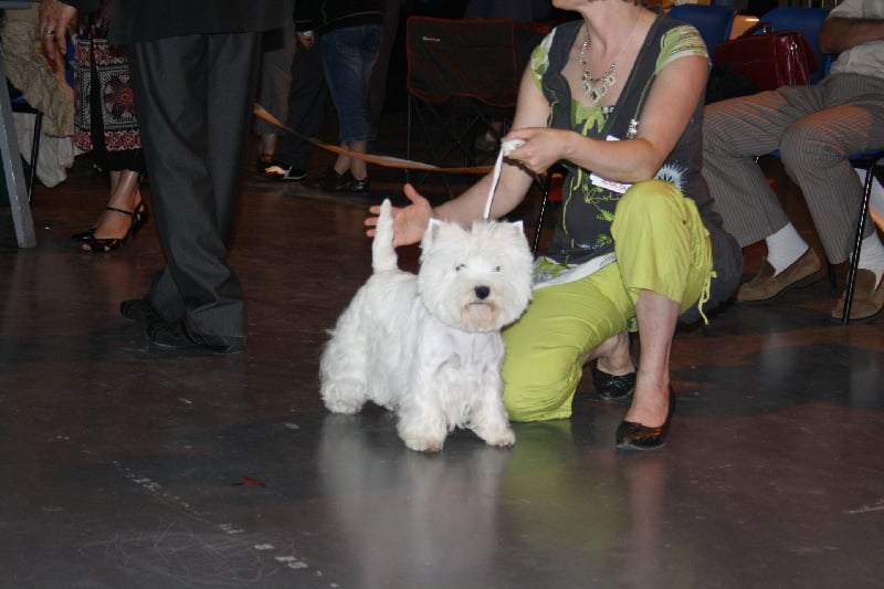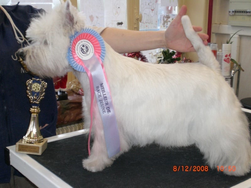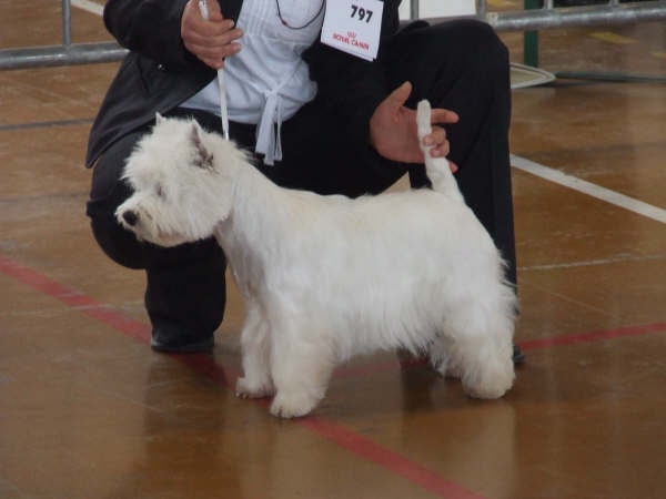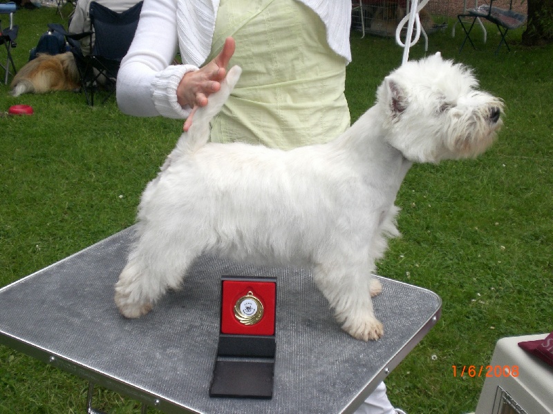 bien typée.tête féminine.dentition complète.yeux foncés bien placés.belle expression.belle sortie d'encolure.poitrine avant bien développée.TB avant et excellent arrière.angulation arrière bien marquée.excellent caractère.TB mouvements